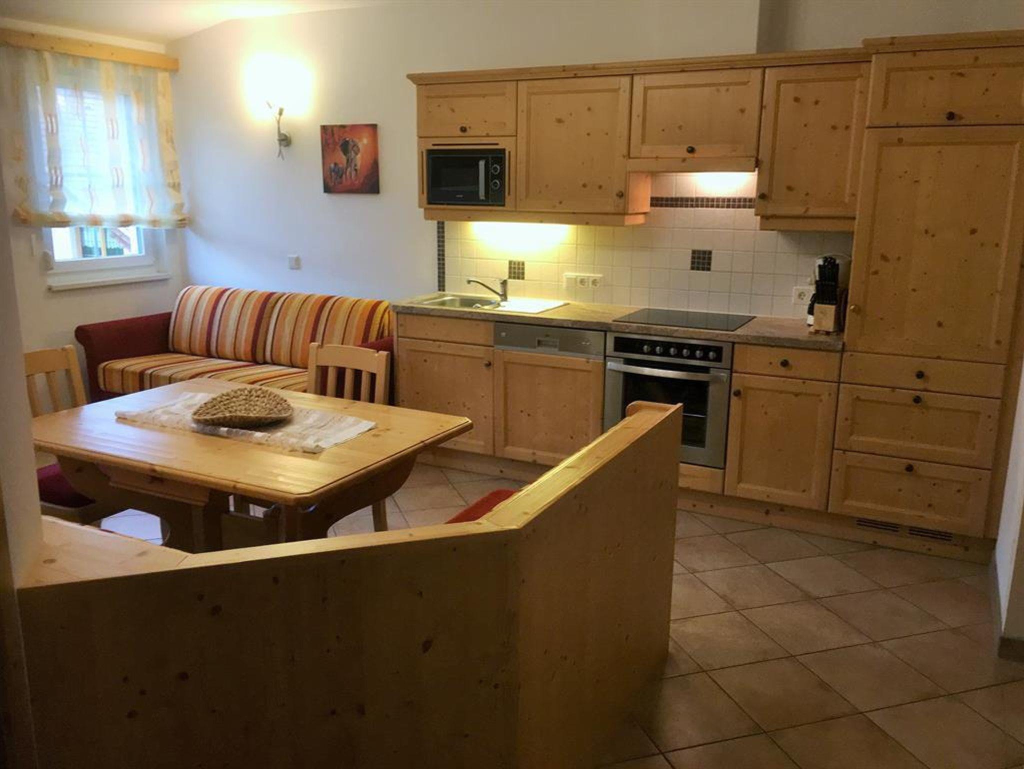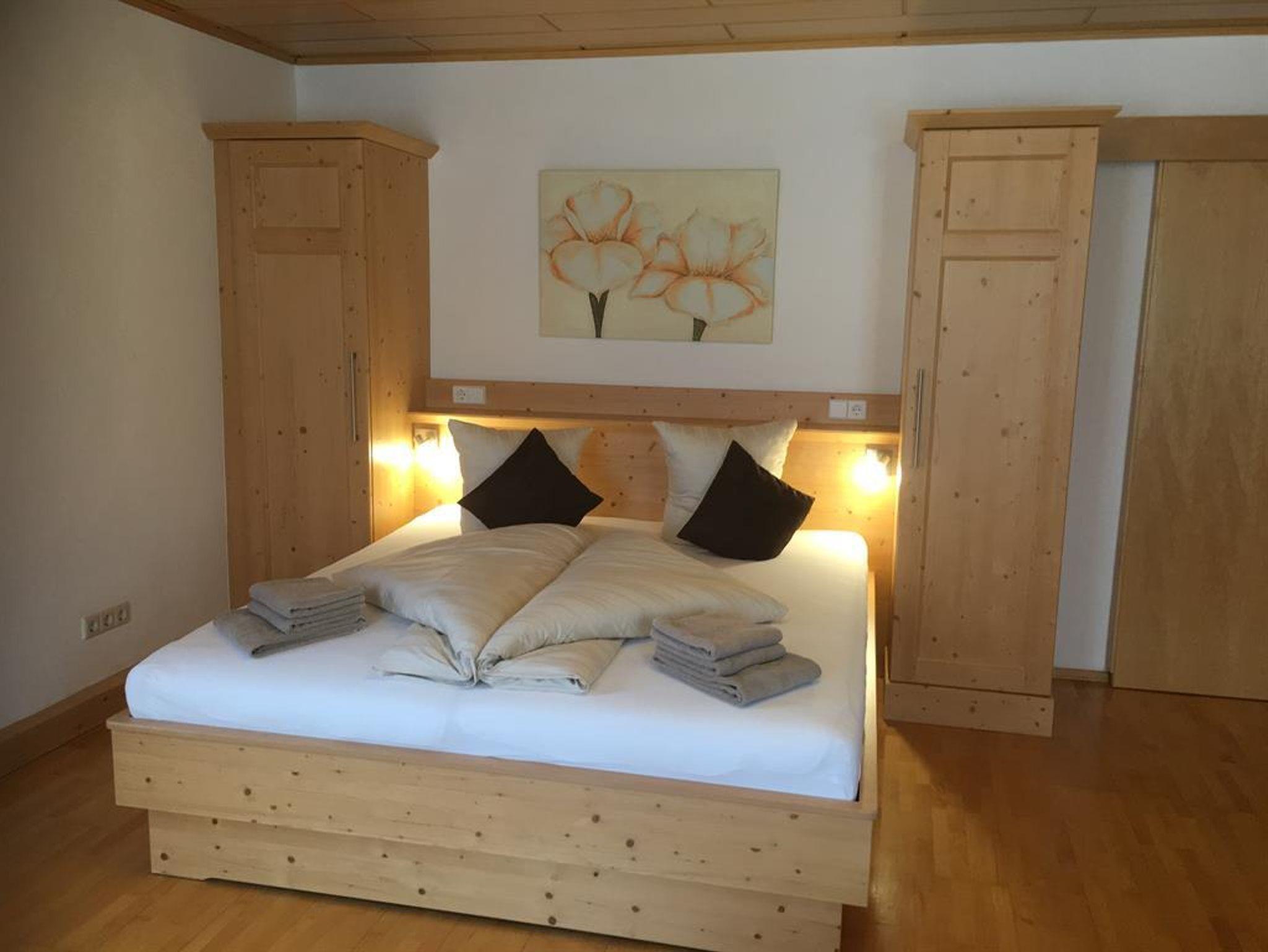 Wenn man morgens in der Ferienwohnung Nr 2 aufwacht, kann man am Südbalkon die Morgensonne genießen. Sie bietet auf rund 60 m² Platz für vier - auf Anfrage bis sechs Personen. Zwei getrennt Schlafzimmer, eine große und gemütliche Wohnküche mit einem ausziehbaren Sofa für zwei Personen und ein Südbalkon. Alles ausgestattet mit Vollholzmöbeln. Das Bad verfügt über eine Dusche und ein Doppelwaschbecken. Das WC ist separat. Die Küche ist voll ausgestattet.