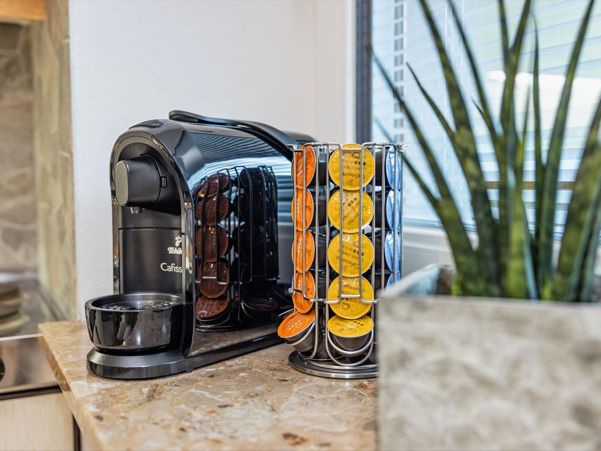Inklusive: Grundausstattung: Salz, Pfeffer, Zucker, Kaffeefilter, Reinigungspulver für Geschirrspüler, Geschirrspülmittel, Toilettenpapier, 1 gratis Kaffeekapsel pro Erwachsenen und Nacht (Tschibo Cafissimo)