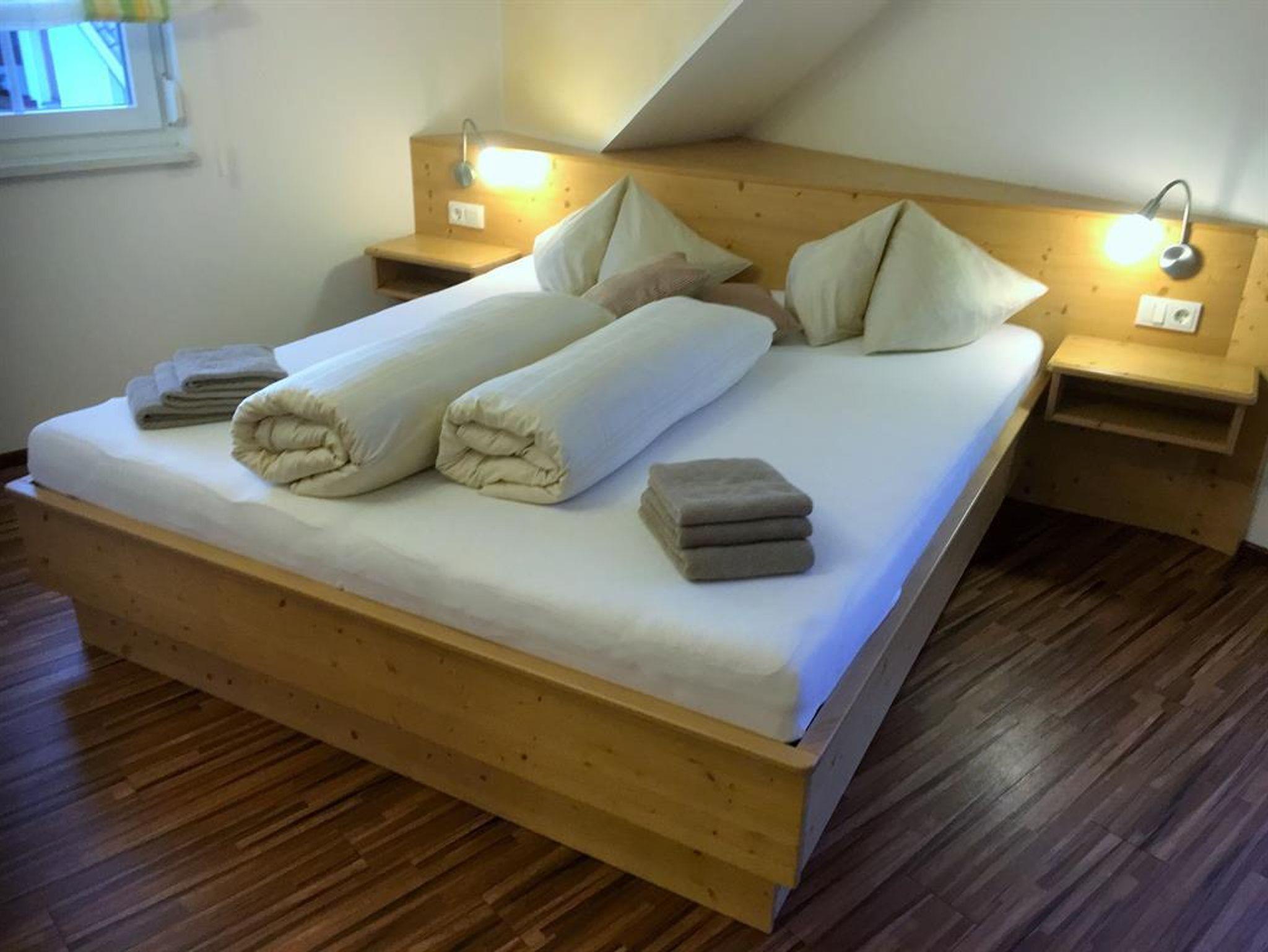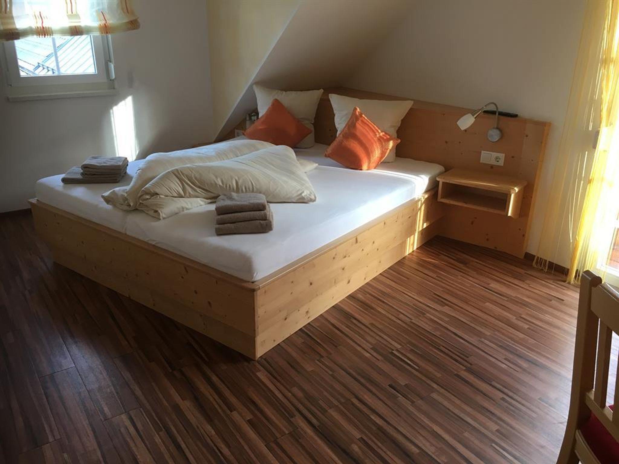Unsere Ferienwohnung drei im zweiten Stock des Hauses bietet auf rund 60 m² Platz für vier - auf Anfrage bis sechs Personen. Zwei getrennt Schlafzimmer, eine große und gemütliche Wohnküche mit einem ausziehbaren Sofa für zwei Personen. Alles ausgestattet mit Vollholzmöbeln. Das Bad verfügt über eine Dusche und das WC ist extra. Die Küche ist voll ausgestattet.