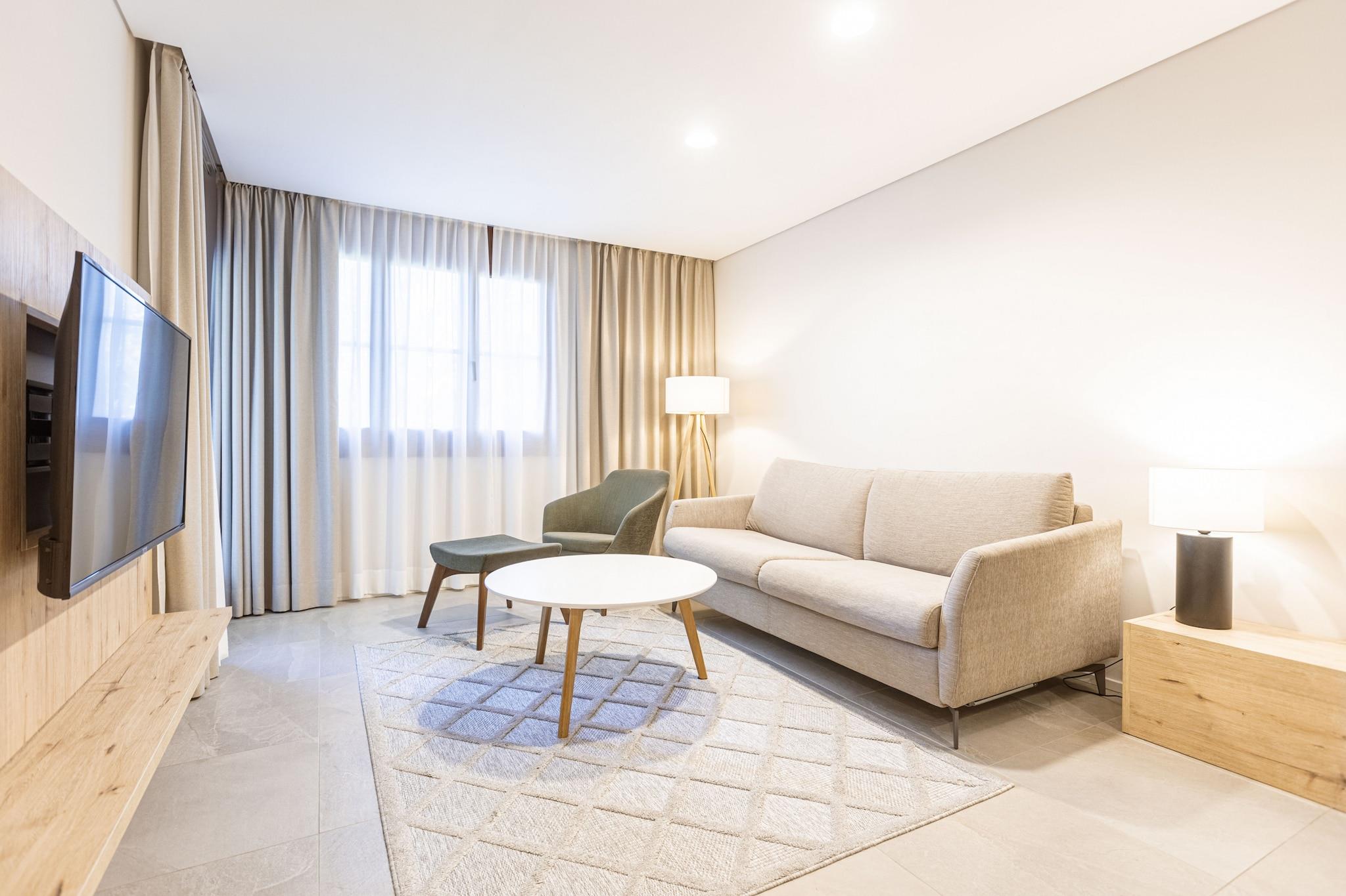 Stue(dobbeltsovesofa, Fjernsyn, spisebord, sofahjørne), åbent køkken(elkedel, brødrister, komfur, kaffemaskine, ovn, mikrobølgeovn, opvaskemaskine , køle-fryseskab), soveværelse(dobbeltseng), badeværelse(bruser), Internetadgang, sauna(deles med andre gæster), balkon, parkering, swimmingpool(deles med andre gæster)