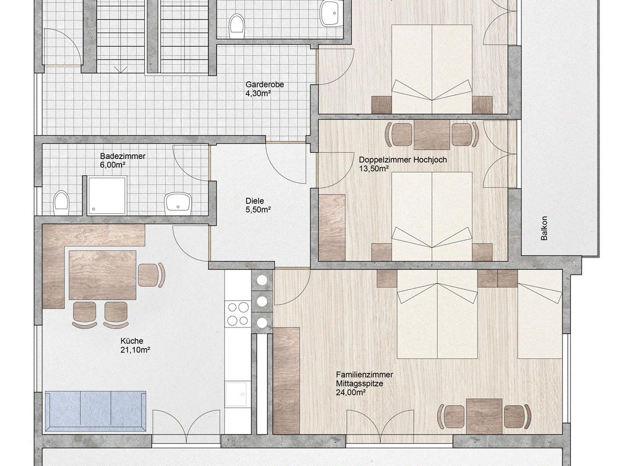 Die Fewo beeinhaltet 1 Doppelzimmer mit Balkon und Du/WC. 1 Doppelzimmer mit Balkon. 1 Dreibettzimmer mit Balkon. 1 seperate Dusche mit WC. Eine Wohnküche mit Sitzgelegenheit und Sofa sowie TV.