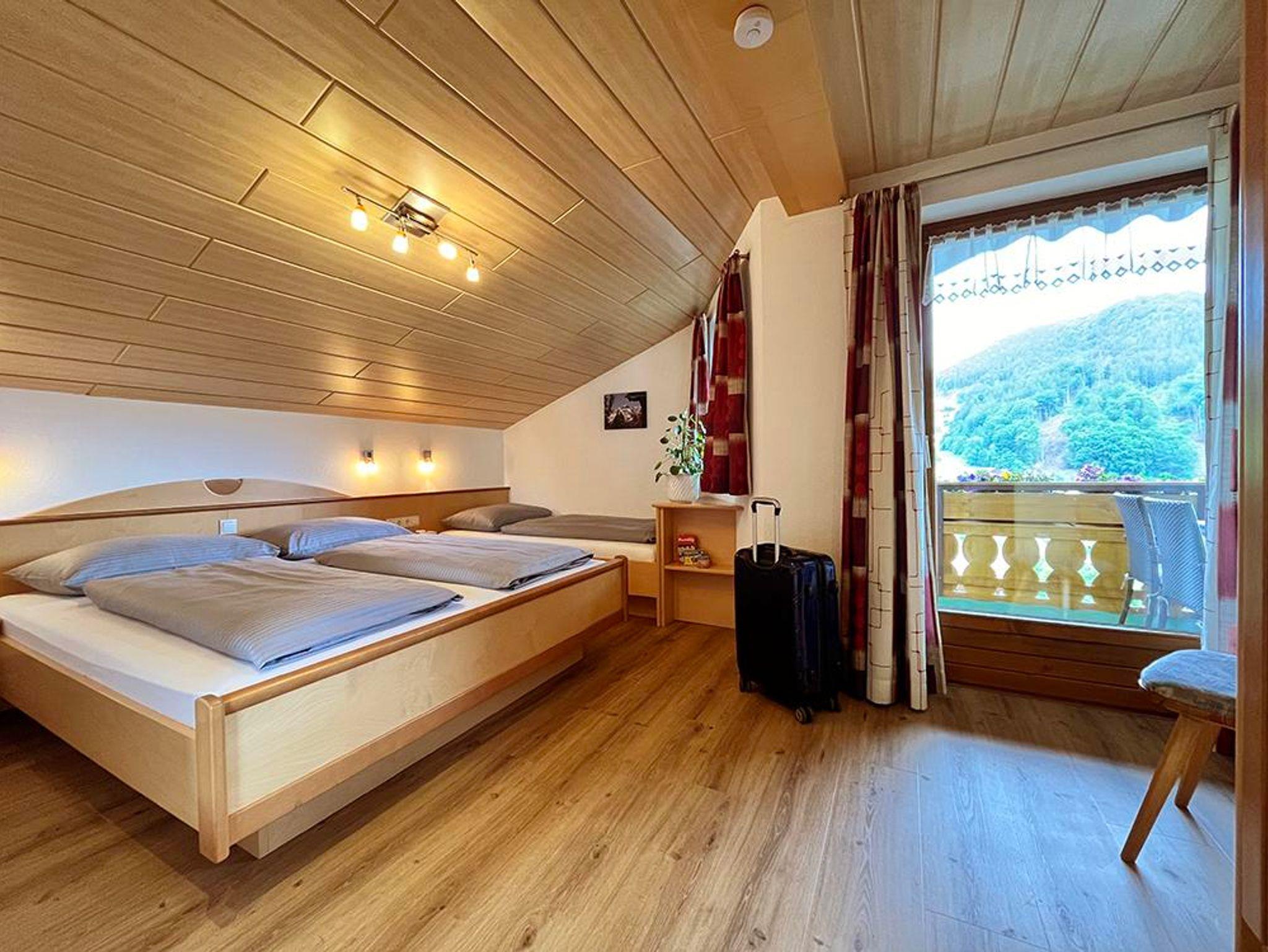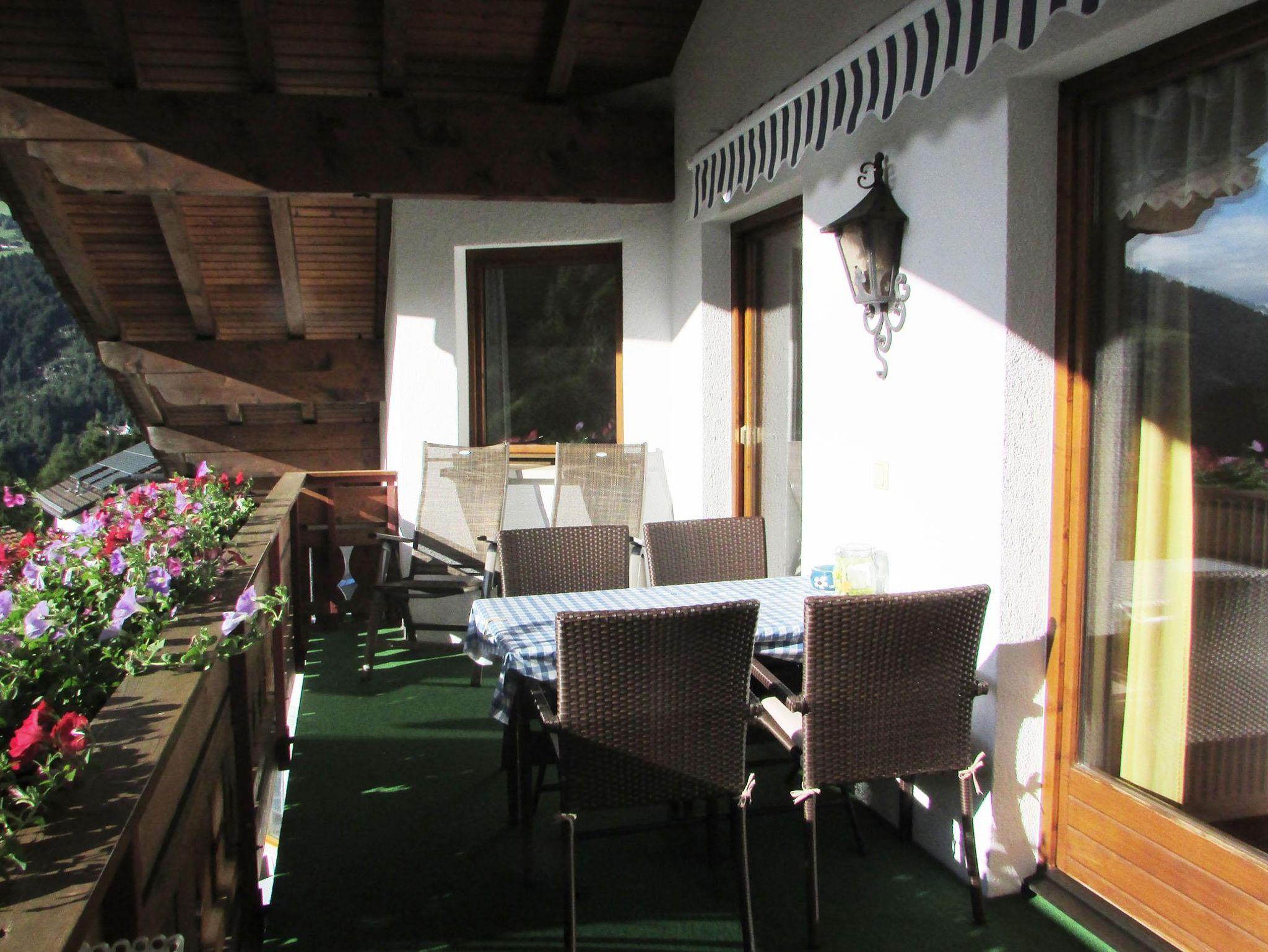 Überdachter Balkon mit schöner Aussicht auf die Berge.