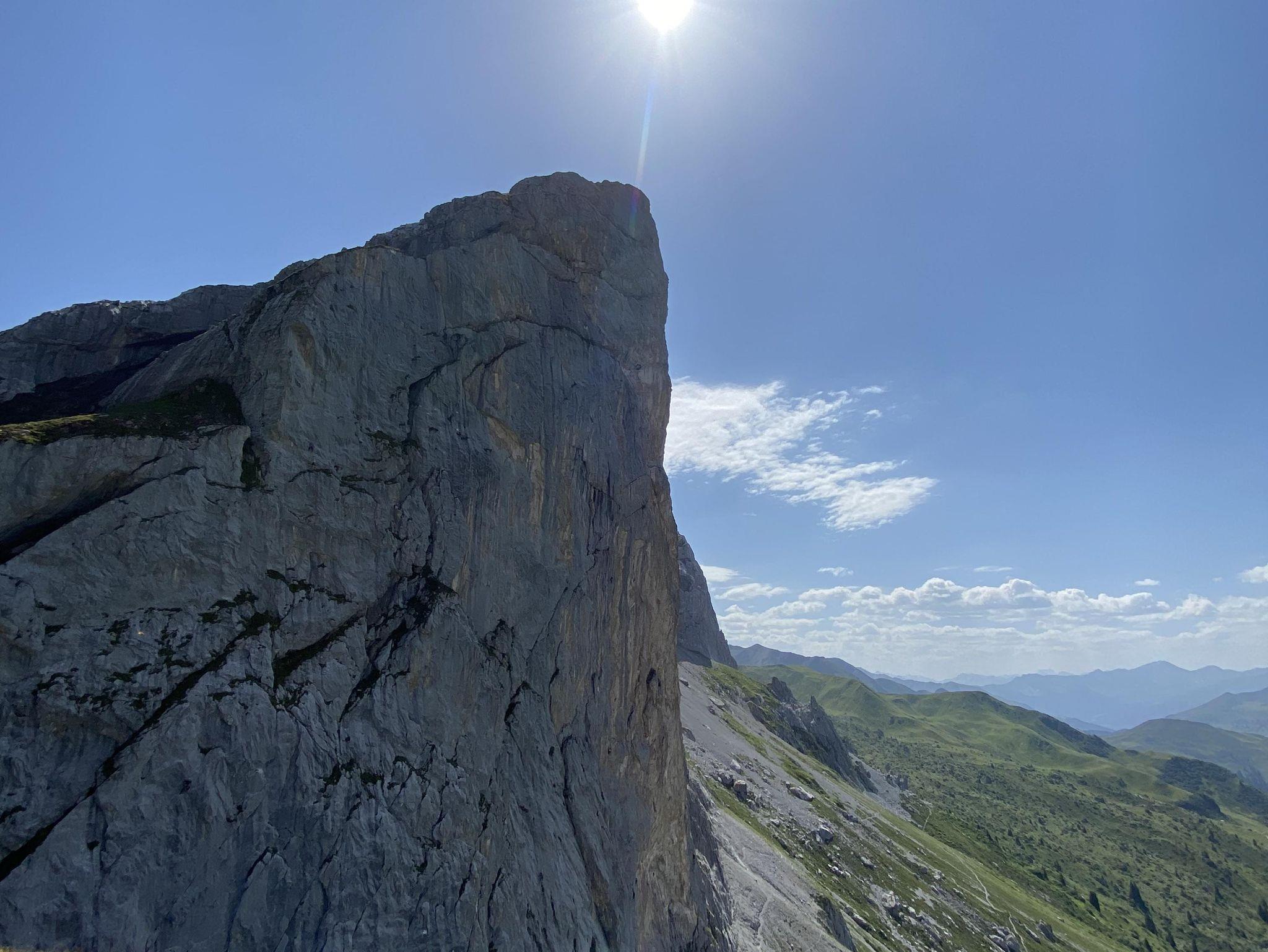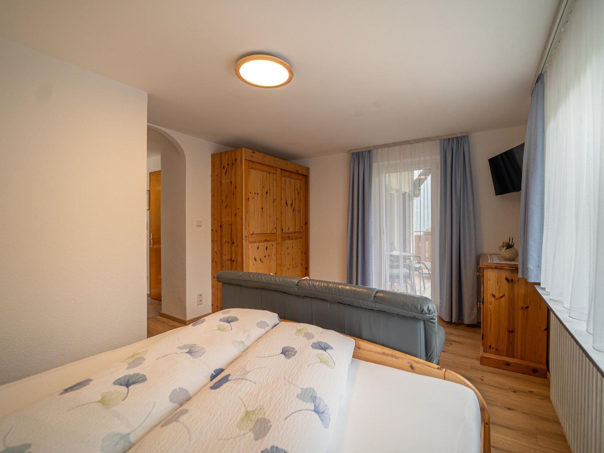 Ferienwohnung Mittagsspitze besteht aus einem kleinen Vorraum mit Garderobe, einer geräumigen, komplett eingerichteten Küche mit Sitzecke und Balkon sowie einem Wohnschlafzimmer und Dusche/WC, ebenfalls mit Balkon.
