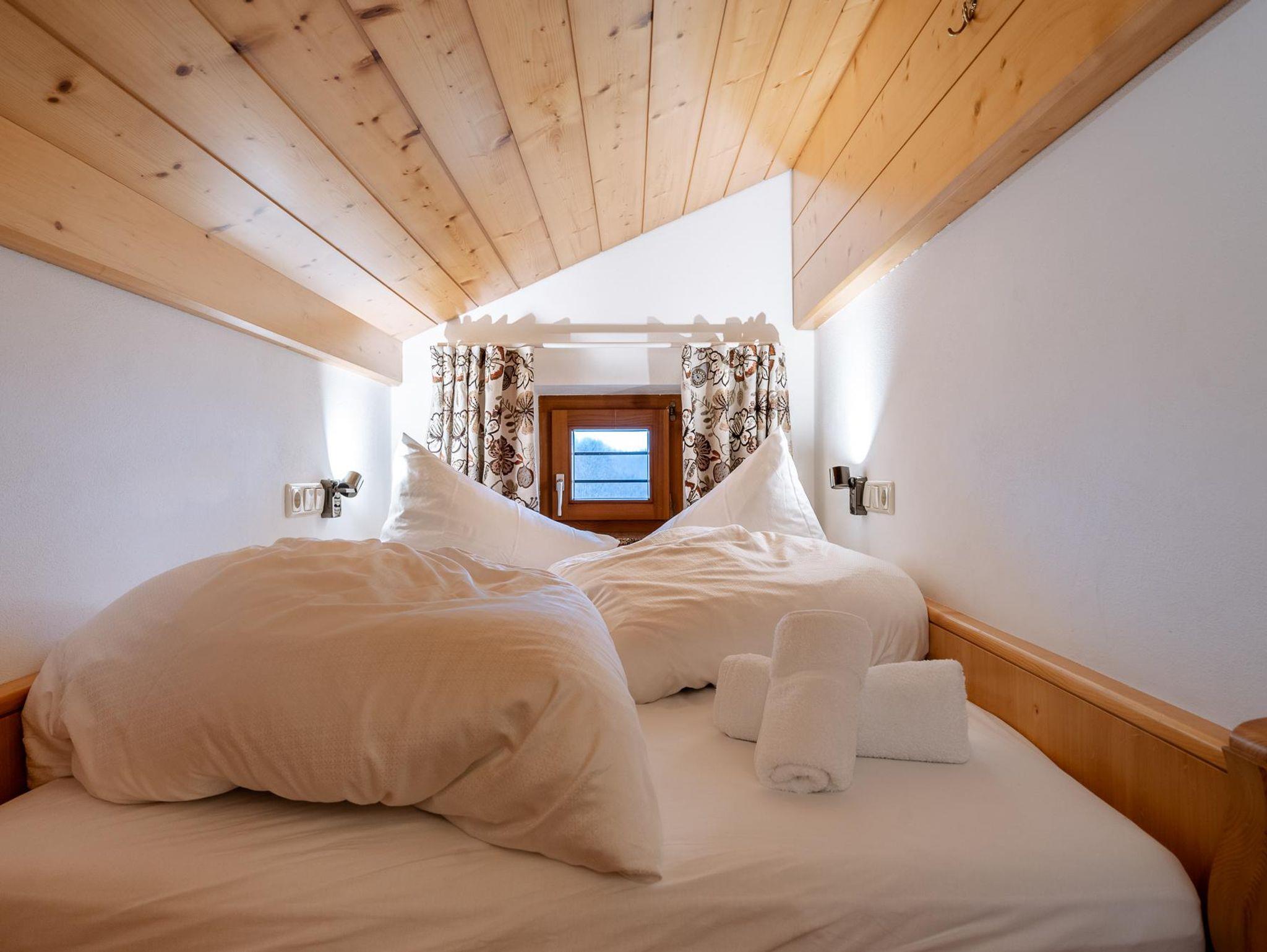 53 m2 im Dachgeschoss, Ostlage, bestehend aus einer großzügigen Wohnküche mit Sitzecke, einem Schlafzimmer mit Doppelbett aus Zirbenholz und einem Einzelbett aus Zirbenholz und einer Schlafkammer (Dachschräge) mit einem Doppelbett (140 x 190 cm), einem Bad mit Dusche, separatem WC und einem Balkon mit Morgensonne.