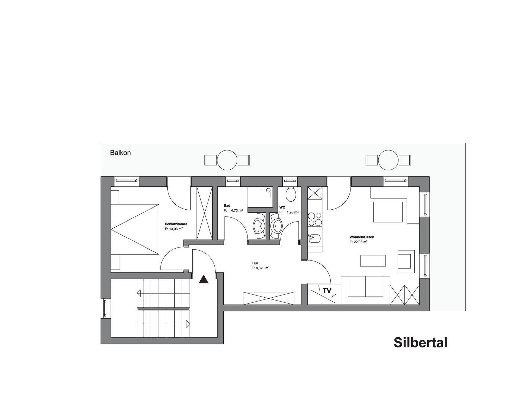 53 m2 im 1. Stock, Süd-/Ostlage, bestehend aus einer großzügigen Wohnküche mit Sitzecke, einem Schlafzimmer mit Doppelbett, einem Bad mit Dusche, separatem WC, einem Flur mit Garderobe und einem großen Balkon über die gesamte Wohnung;