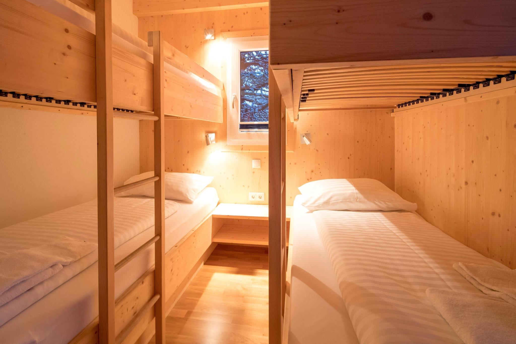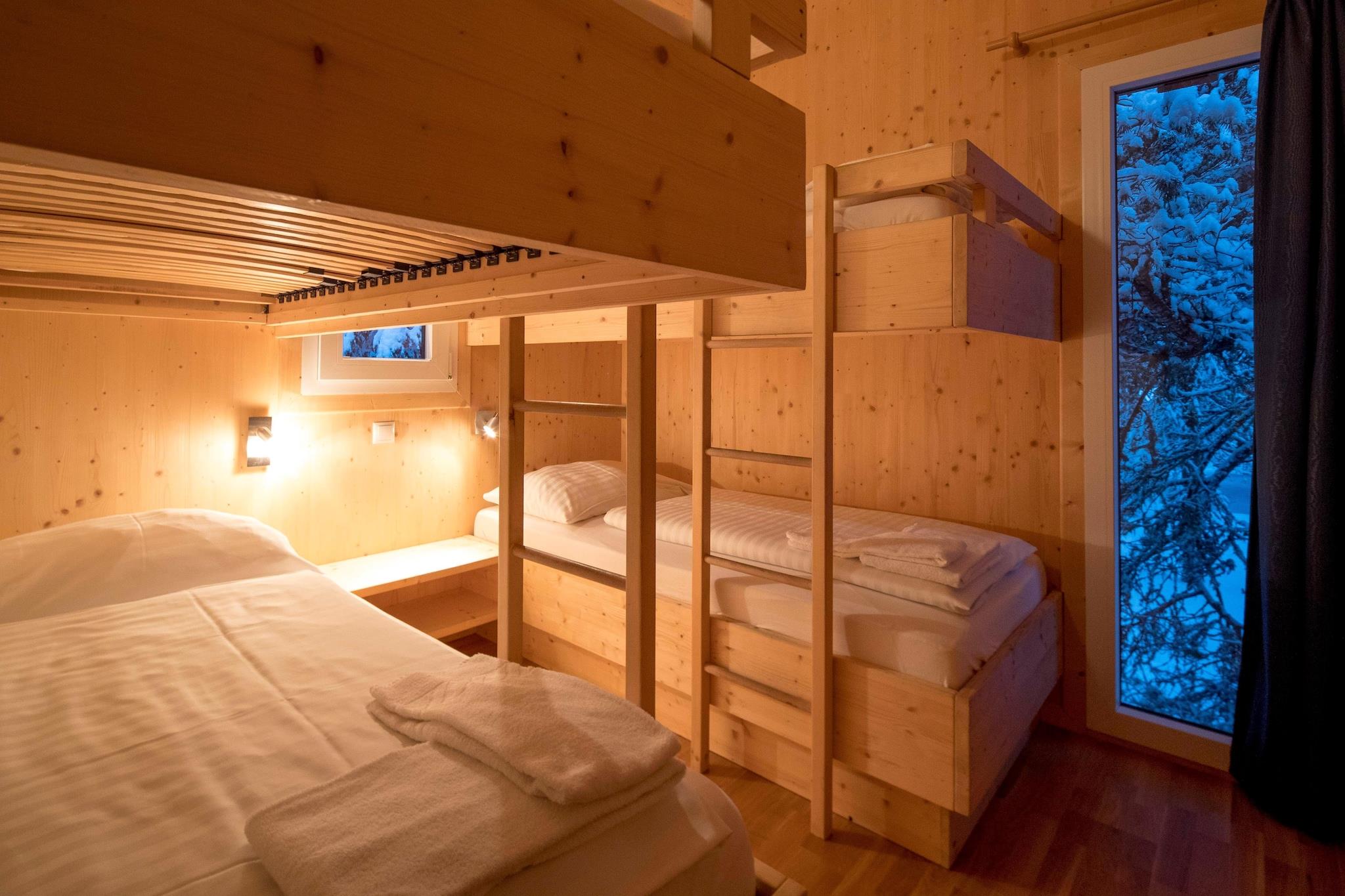 Velkommen til dit alpine paradis! Denne rummelige hytte på 140 m² i massivt træ kan komfortabelt rumme op til 16 personer, hvilket gør den til det perfekte valg til store familiefester eller grupperejser. Beliggende i en stille fyrreskov i 1.800 meters højde, kombinerer denne chalet traditionel charme med moderne bekvemmeligheder for et uforglemmeligt ophold. Nyd den betagende udsigt fra balkonen, som er et perfekt sted at nyde den naturlige skønhed i det omkringliggende område. Efter en begivenhedsrig dag kan du slappe af i den infrarøde sauna eller i det runde spabad (kun brugbart om sommeren!), som tilbyder en luksuriøs afslutning på dagen. Hyttens førsteklasses beliggenhed giver nem adgang til vandreture, skiløb og cykling, med centrum og skoven tæt på for nem udforskning. Hytten har seks indbydende soveværelser: fire med dobbeltsenge og to med køjesenge, der hver tilbyder fleksible sovemuligheder for alle. Med fire moderne badeværelser, hver udstyret med bruser, er der plads og komfort nok til hele din gruppe. Det åbne køkken er fuldt udstyret til at opfylde alle dine kulinariske behov, herunder bestik, køkkengrej, keramisk kogeplade, ovn, opvaskemaskine og køleskab, fryser. Andre faciliteter såsom brødrister, kedel og kaffemaskine er også inkluderet. For at sikre, at dit ophold kommer godt fra start, står et lille startsæt med opvaskemaskinefaner, opvaskemiddel (prøve), svamp, affaldssække, rengøringsmidler og et viskestykke klar ved din ankomst. Hold forbindelsen med gratis Wi-Fi, og nyd dine foretrukne satellit-tv-shows. Med Butler Card eller Butler Program får du personlig service, der vil gøre dit ophold endnu mere behageligt. Nyd den perfekte blanding af komfort, stil og eventyr i dette storslåede alpine tilbagetog.