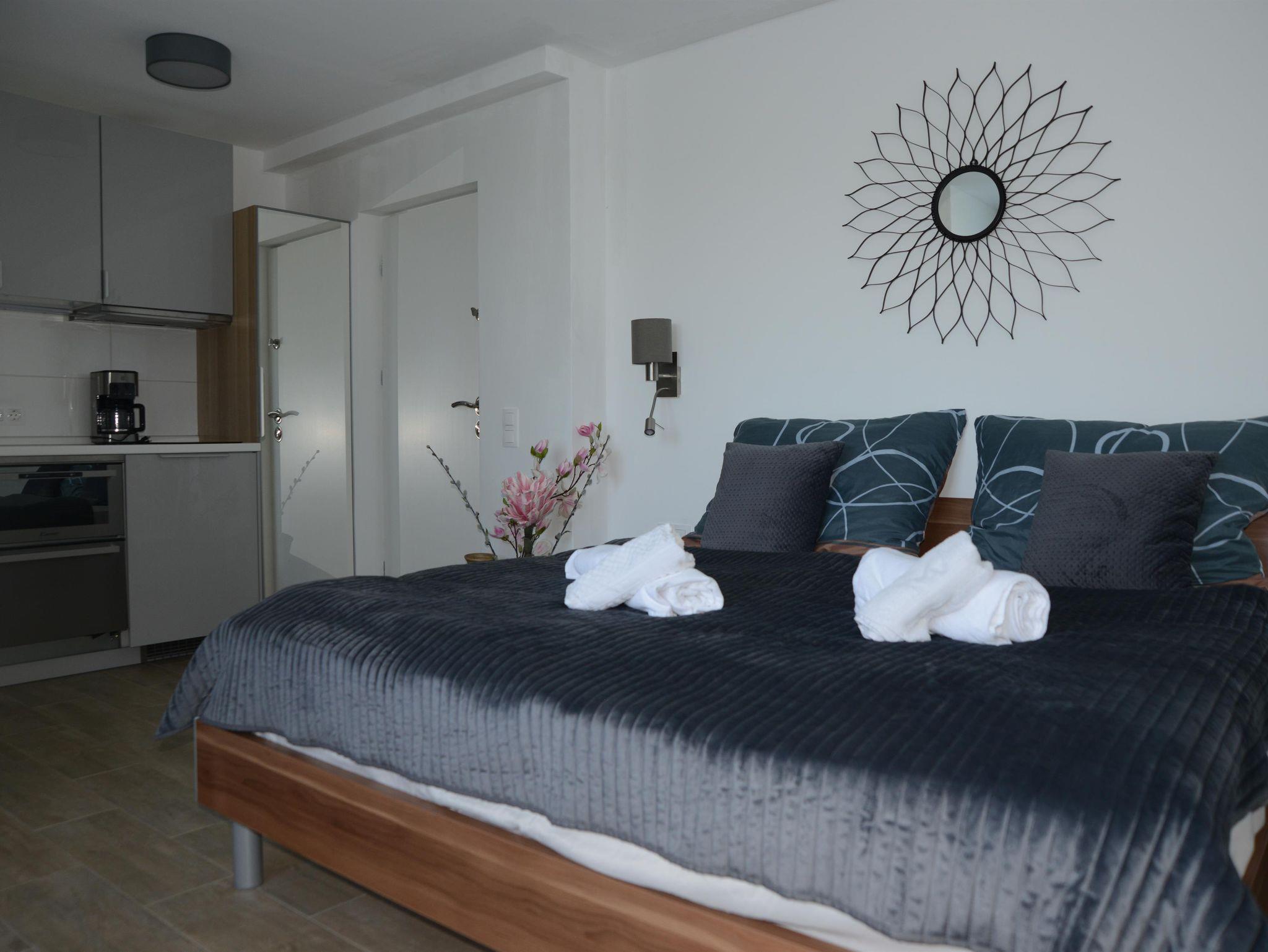 Dieses Appartement ist neu entstanden . Im Zimmer befindet sich eine kleine Küchenzeile. Im Zimmerpreis ist aber das Frühstück enthalten. Vor dem Haus ist für die Studiogäste eine kleine Überdachte Terrasse. Das Zimmer ist 16,5m² groß und die Terrasse ist 6,5m².