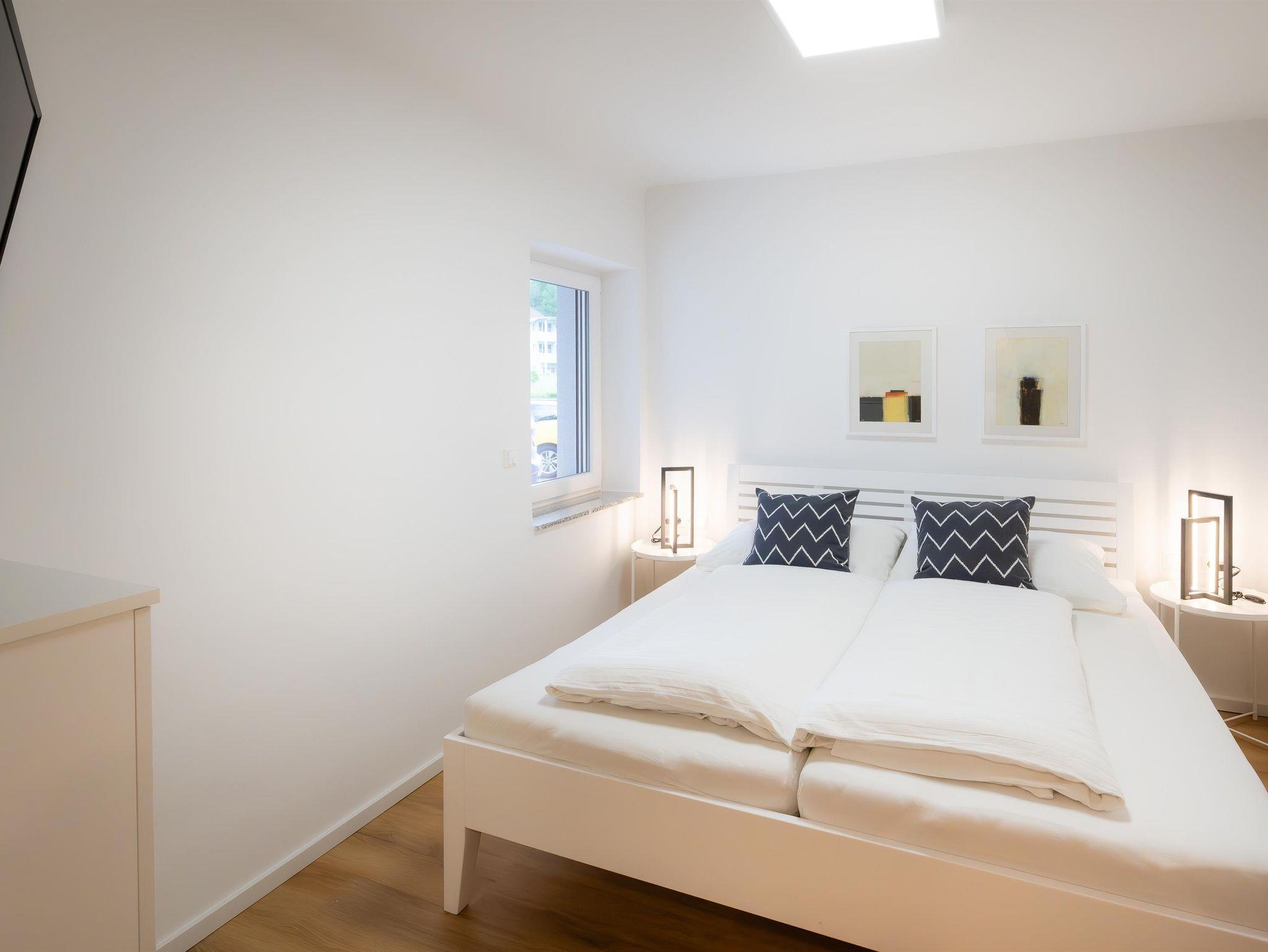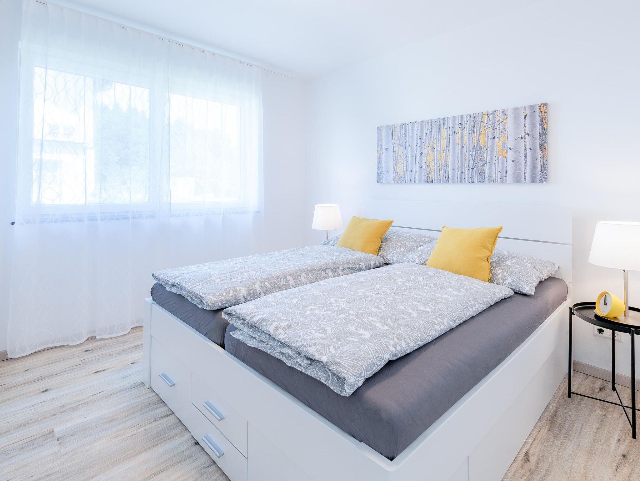 • Ein Schlafzimmer mit bequemen Doppelbett