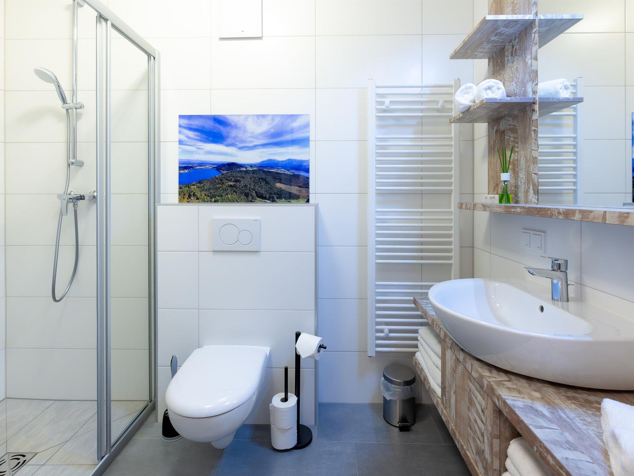 Das komfortable Badezimmer verfügt über einen Waschtisch, eine Dusche sowie eine Toilette. Hand-, Duschtücher, Fön und elektr. Handtuchtrockner sind vorhanden.