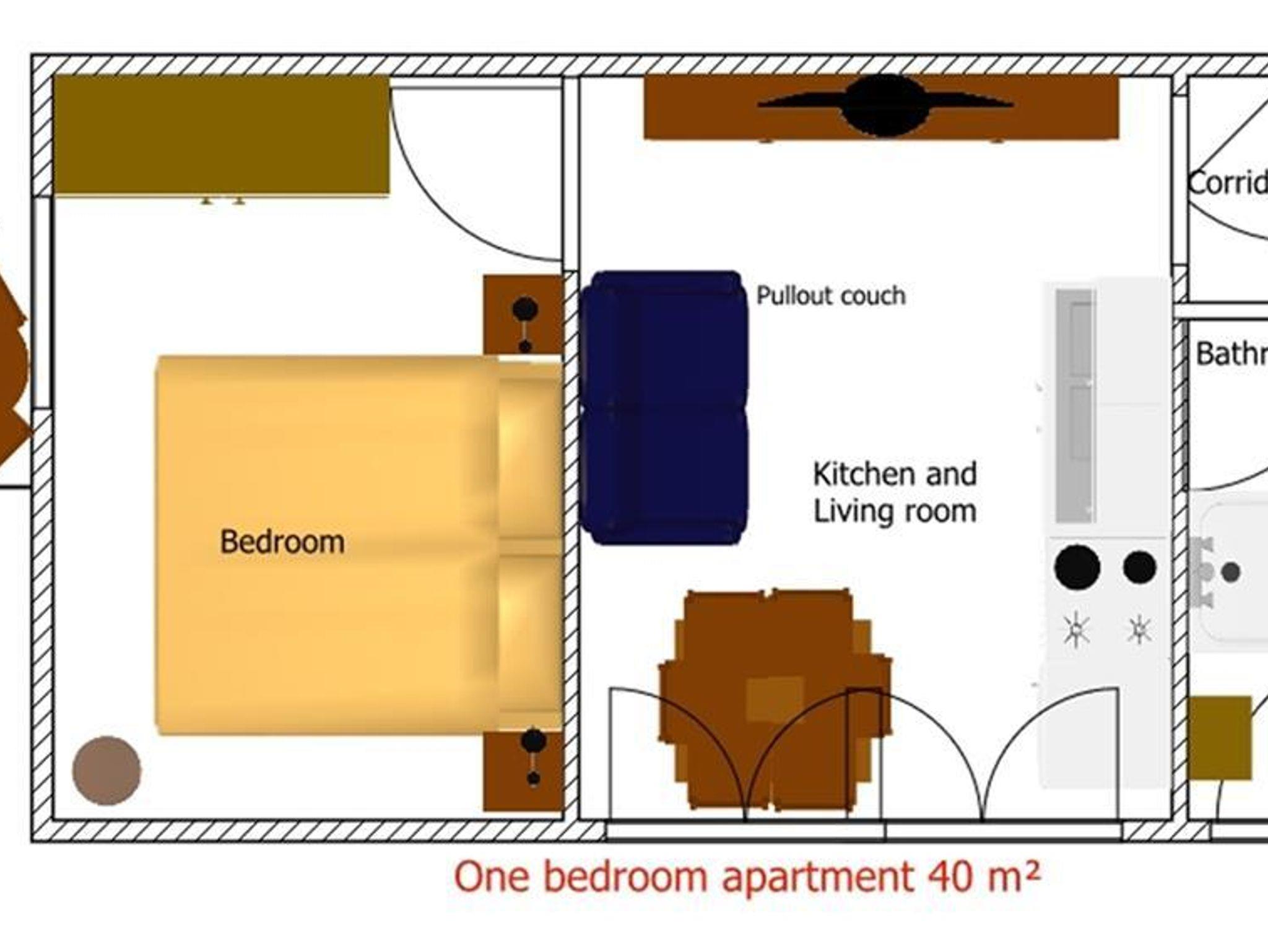 Appartement 1: Elektroherd mit vier Herdplatten, Kühlschrank, Kaffeemaschine, Wasserkocher, extra Vorraum, Bad/Dusche/WC, Föhn, Balkon, Couch, Sitzgruppe, Sat-TV, Radio.