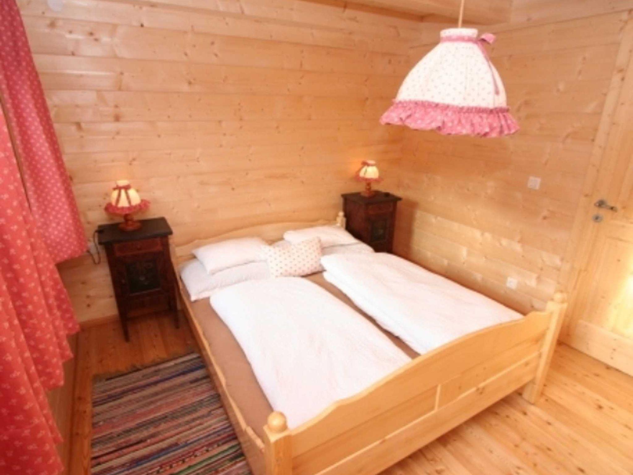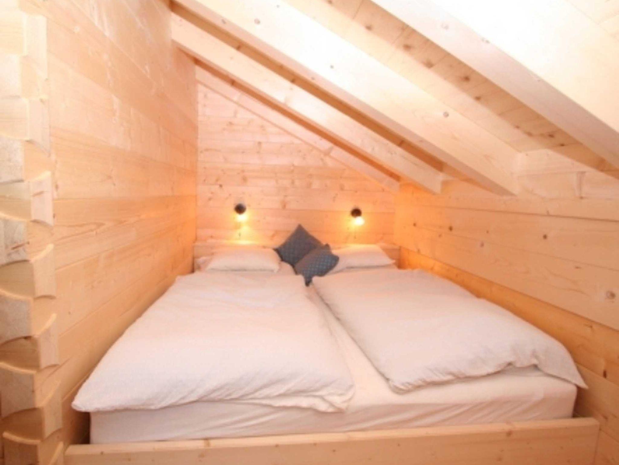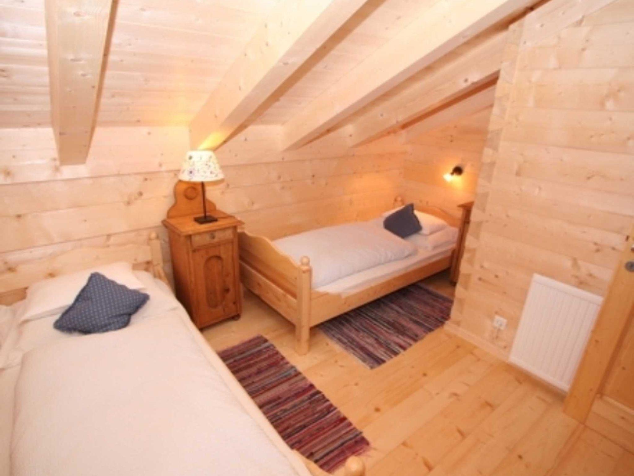 5-Zimmer-Chalet 75 m2 auf 2 Stockwerken, teilweise abgeschrägt, romantisch und mit viel Holz eingerichtet: Eingang. 1 Doppelzimmer mit E-Heizung. Wohnküche (4 Kochplatten, Backofen, Geschirrspüler, Glaskeramikherd, Mikrowelle, Tiefkühler, elektrische Kaffeemaschine) mit Essecke und Kachelofen. Ausgang zur Terrasse. Dusche, sep. WC. Bodenheizung. Obergeschoss: (steile Treppe) abgeschrägtes, offenes Wohn-/Schlafzimmer mit 1 Doppeldiwanbett (2 x 90 cm, Länge 200 cm), Kabel-TV und DVD. 2 abgeschrägte Doppelzimmer. Zur Verfügung: Holz (gratis). Internet (Wireless LAN, gratis).
