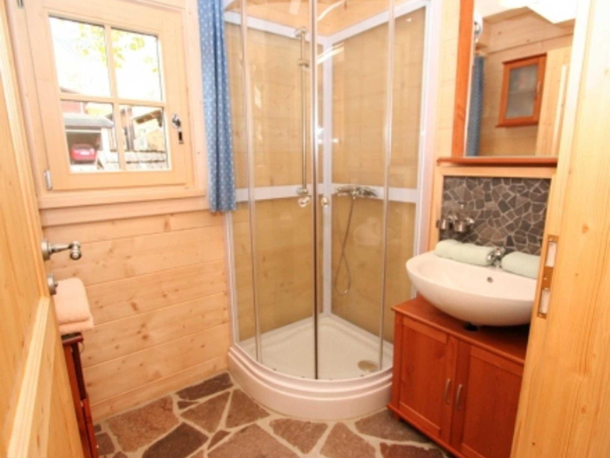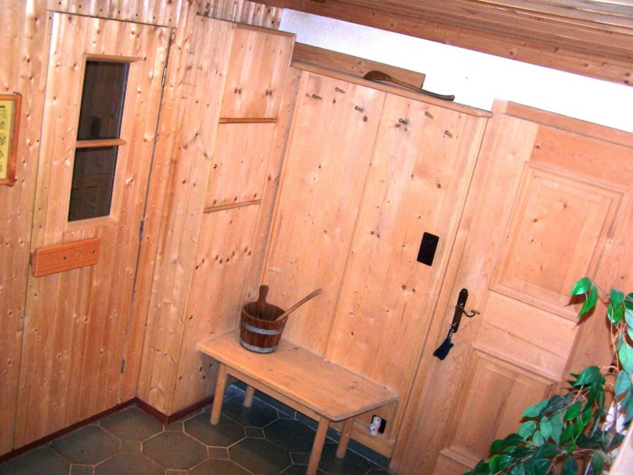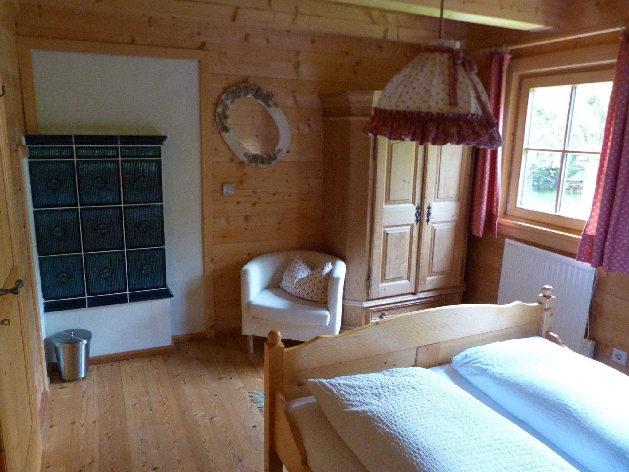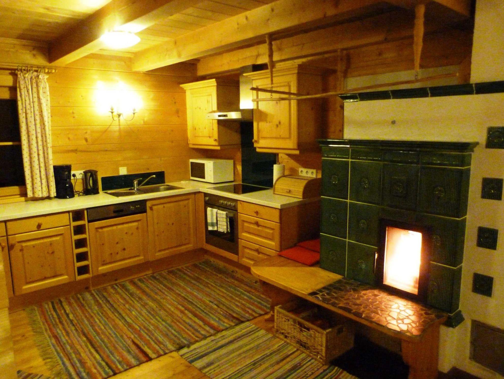 5-Zimmer-Chalet 75 m2 auf 2 Stockwerken, teilweise abgeschrägt, romantisch und mit viel Holz eingerichtet: Eingang. 1 Doppelzimmer mit E-Heizung. Wohnküche (4 Kochplatten, Backofen, Geschirrspüler, Glaskeramikherd, Mikrowelle, Tiefkühler, elektrische Kaffeemaschine) mit Essecke und Kachelofen. Ausgang zur Terrasse. Dusche, sep. WC. Bodenheizung. Obergeschoss: (steile Treppe) abgeschrägtes, offenes Wohn-/Schlafzimmer mit 1 Doppeldiwanbett (2 x 90 cm, Länge 200 cm), Kabel-TV und DVD. 2 abgeschrägte Doppelzimmer. Zur Verfügung: Holz (gratis). Internet (Wireless LAN, gratis).