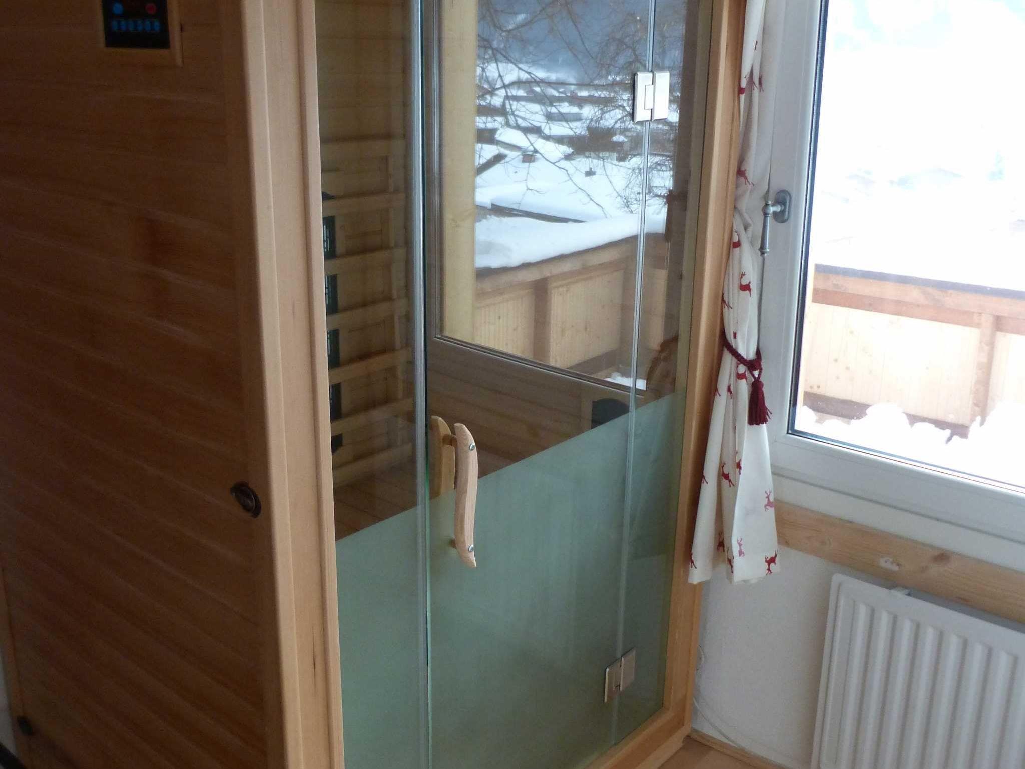 5-Zimmer-Chalet 85 m2 ebenerdig, romantisch und mit viel Holz eingerichtet: Eingang. 1 Doppelzimmer mit E-Heizung und SAT-TV, 1 Doppelzimmer mit E-Heizung und Pelletsofen.