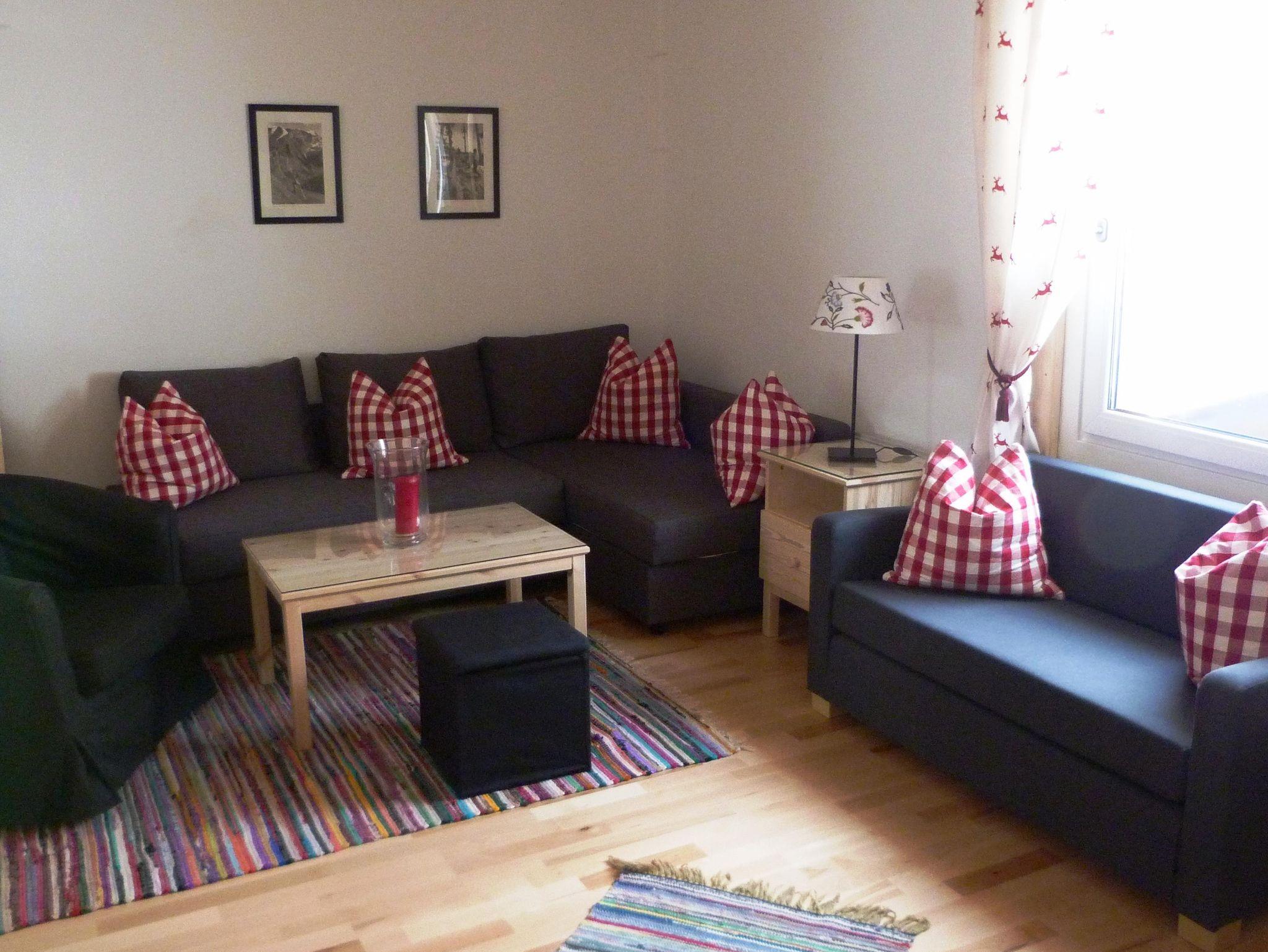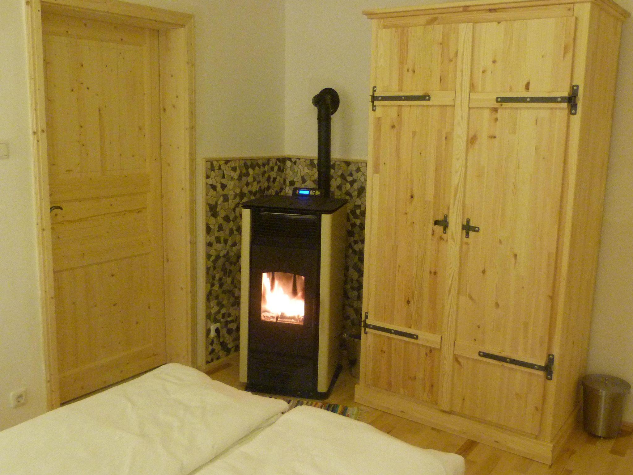 5-Zimmer-Chalet 85 m2 ebenerdig, romantisch und mit viel Holz eingerichtet: Eingang. 1 Doppelzimmer mit E-Heizung und SAT-TV, 1 Doppelzimmer mit E-Heizung und Pelletsofen. Wohnküche (4 Kochplatten, Backofen, Geschirrspüler, Glaskeramikherd, Mikrowelle, Tiefkühler, elektrische Kaffeemaschine) mit Essecke. Offenes Wohn-/Schlafzimmer mit Doppeldiwanbett (2 x 90cm, Länge 200 cm) mit Kaminofen, SAT-TV und DVD Player. Ausgang zur Terrasse. Bad mit Doppelwaschbecken, Dusche und Waschmaschine, sep. WC. Bodenheizung. Zur Verfügung: Holz (gratis) und Pellets. Internet (Wireless LAN, gratis).
