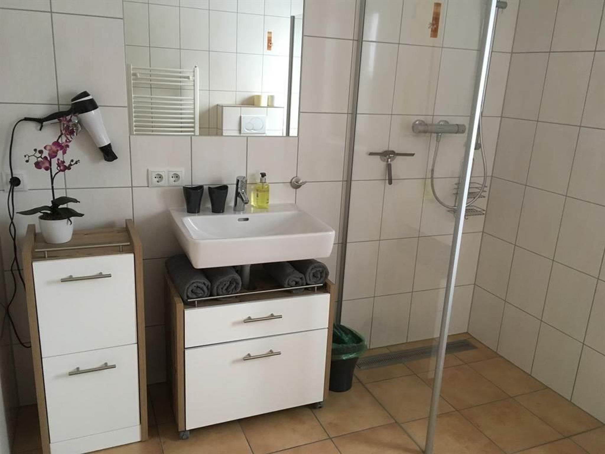 1 Bad mit ebenerdiger Dusche, WC, Fön, Handtuchtrockner
