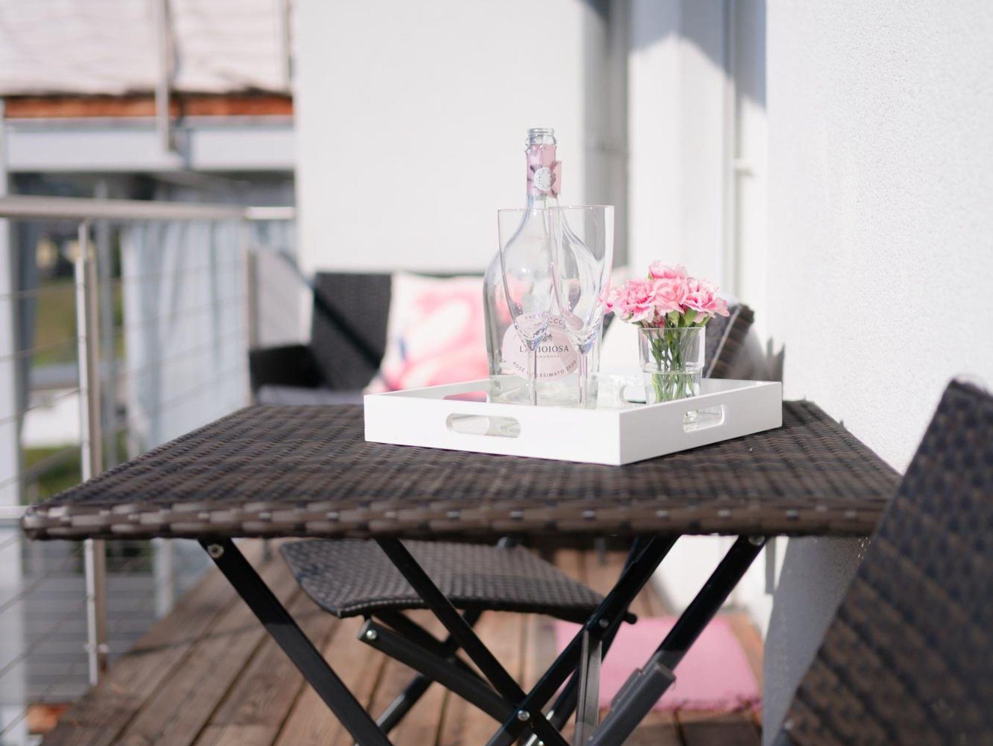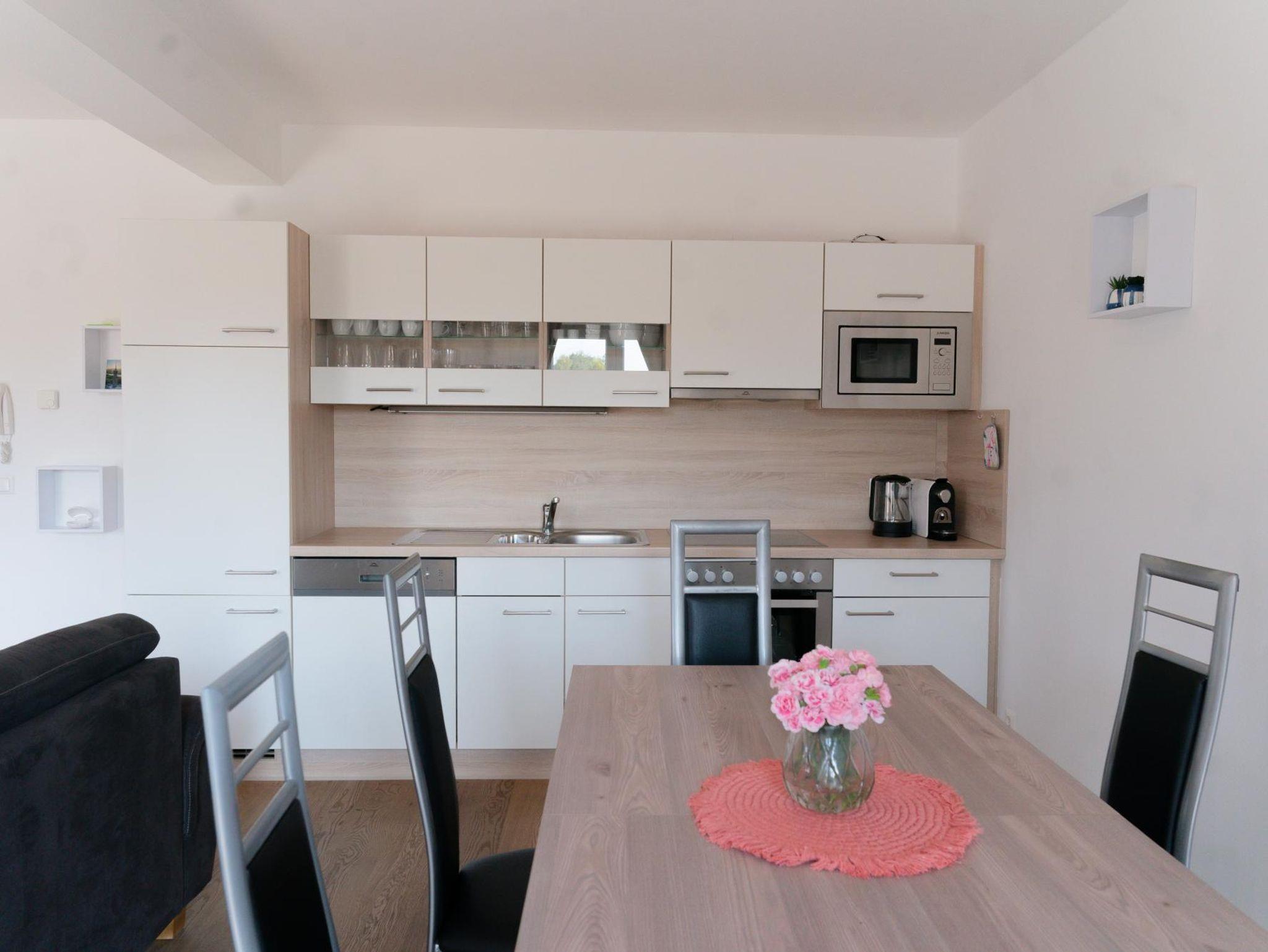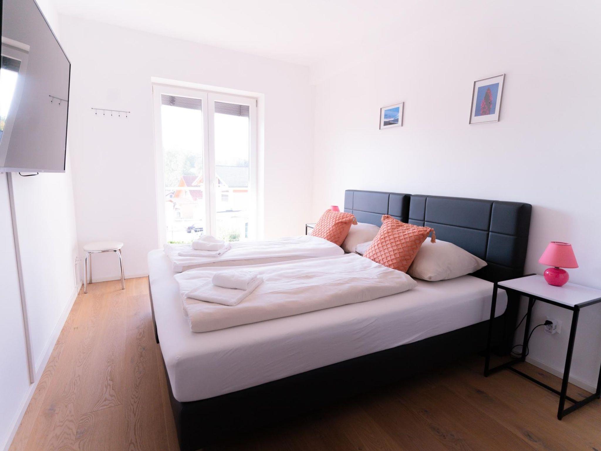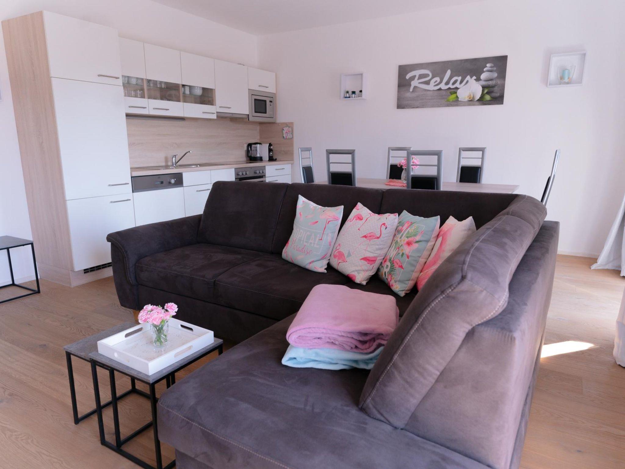 Das Apartment verfügt über 2 Schlafzimmer, eines mit einem gemütlichen Doppelbett und eines mit zwei Einzelbetten, die zu einem Doppelbett zusammengeschoben werden können. Die Lounge im Wohnbereich bietet eine gemütliche Sitz- und Schlafgelegenheit für weitere 2 Personen. In der hellen Wohnküche befindet sich ein (ausziehbarer) Essbereich, der Platz für 6 Personen bietet und eine voll ausgestattete Küche. Der schöne Sonnenbalkon ist vom Wohnzimmer, dem Essbereich und dem Schlafzimmer aus erreichbar. Das Badezimmer ist mit einer Badewanne, einer Dusche, einem WC, einem Waschtrockner und einem Handtuchtrockner ausgestattet. Zusätzlich gibt es noch ein separates WC. Ein Carport- Stellplatz vor dem Haus steht kostenlos zur Verfügung.