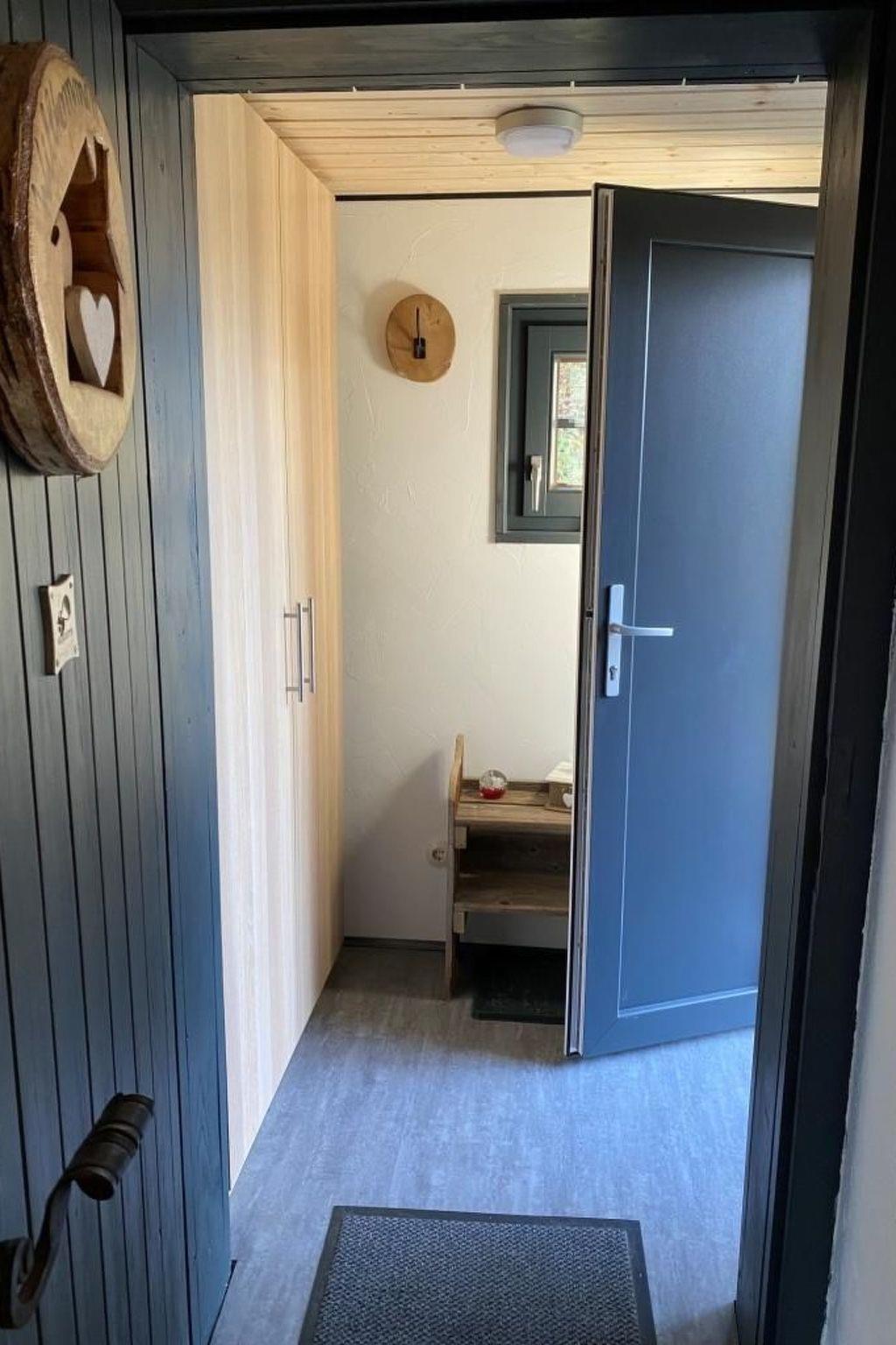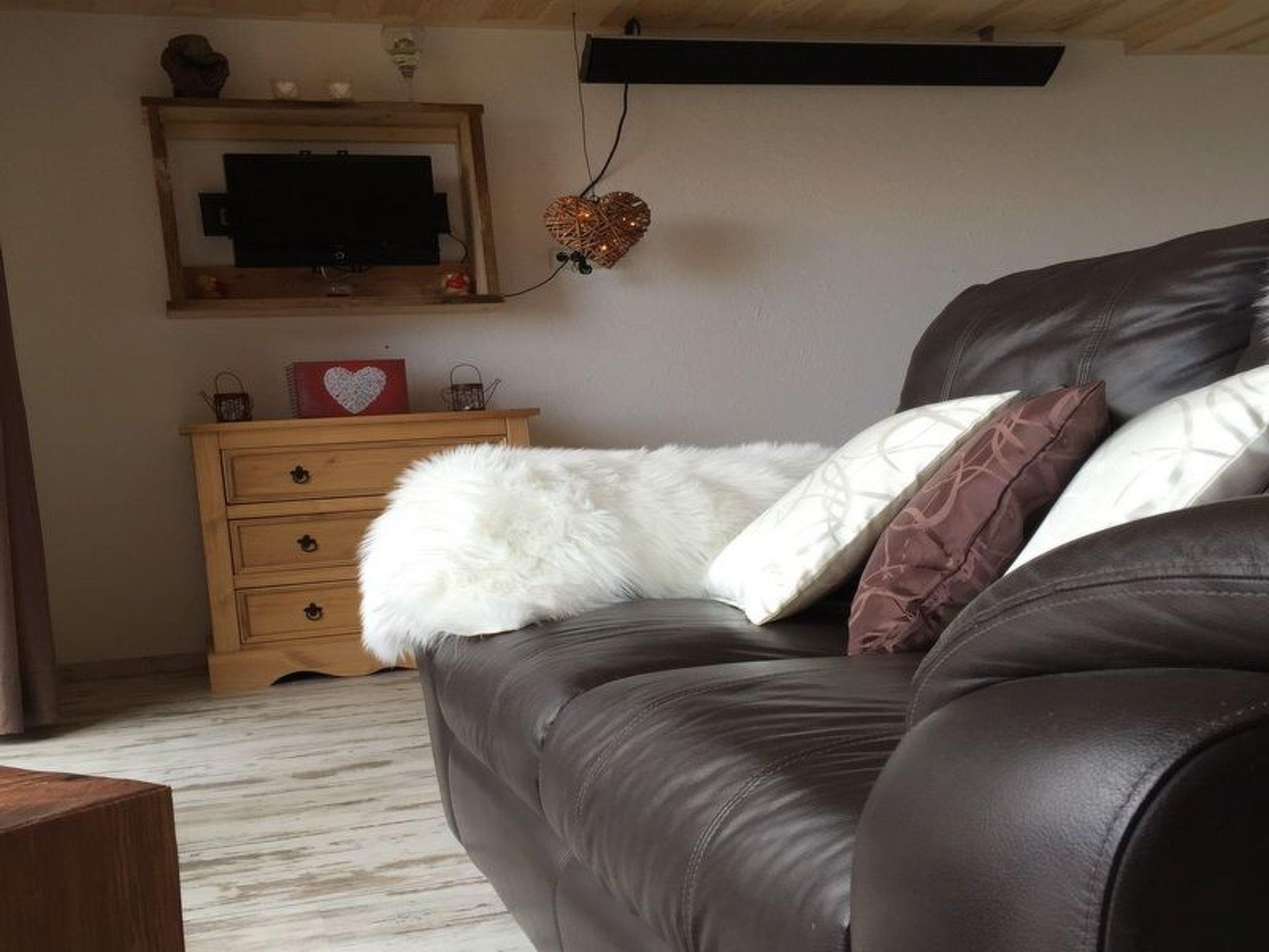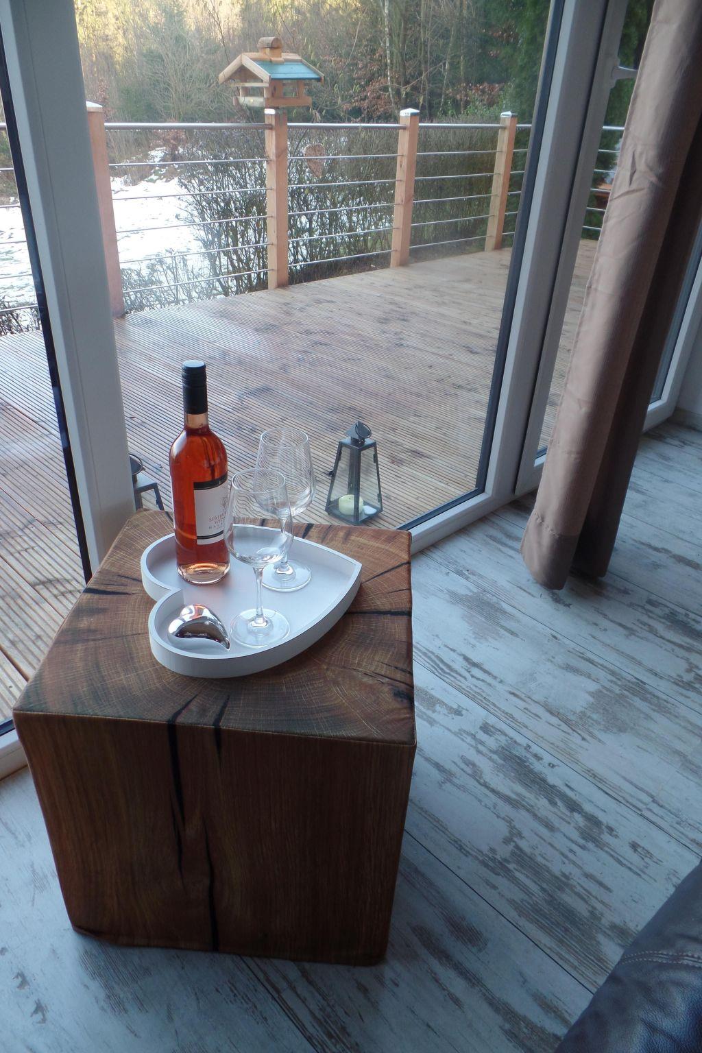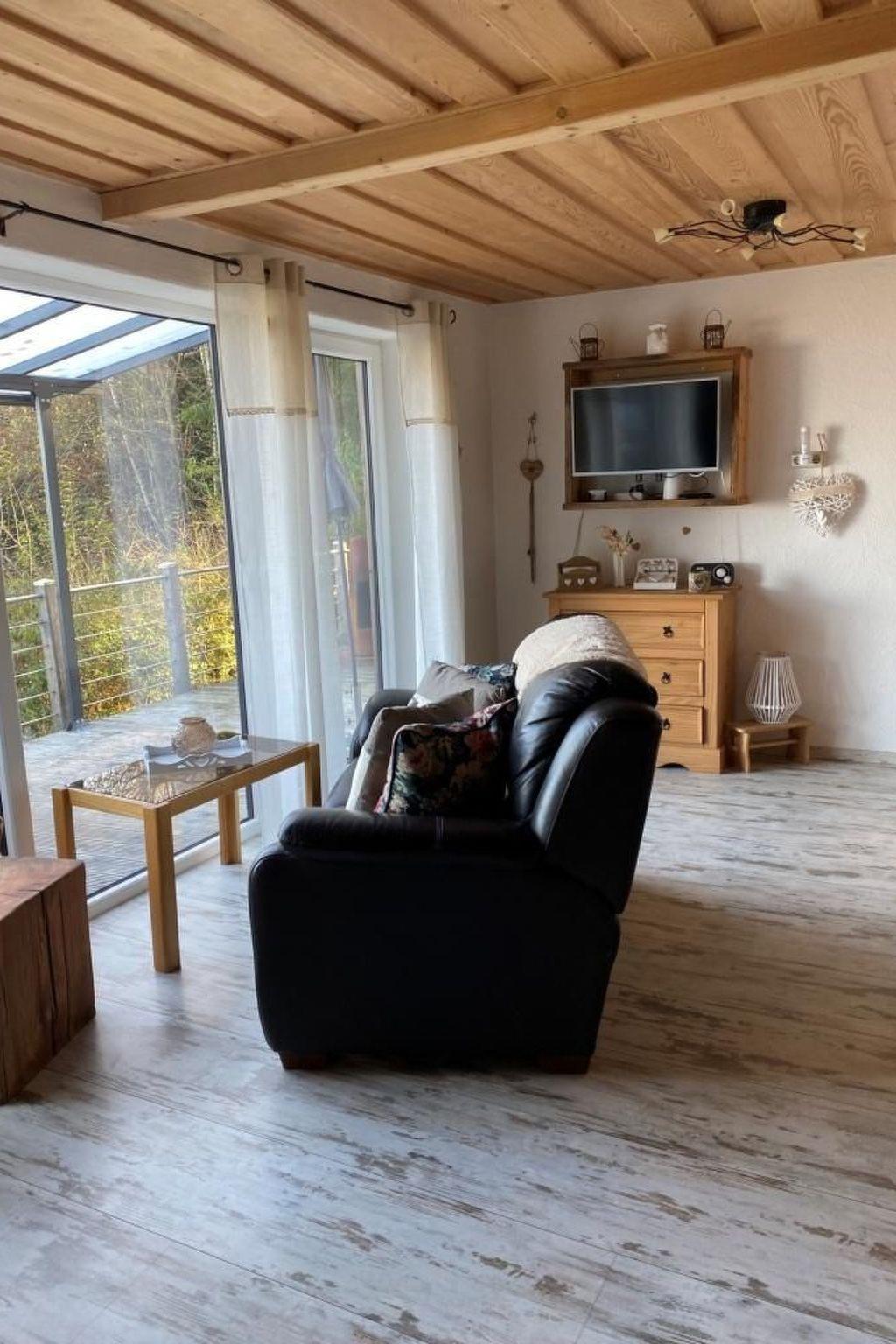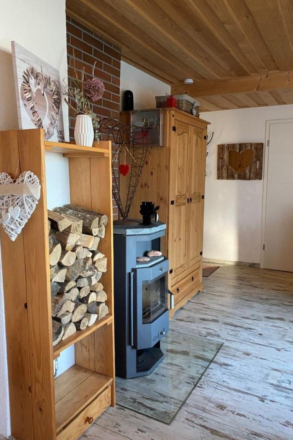 Inside the accommodation, comfortable leather furniture and a warm open fire create a cosy and relaxed ambience. Take a seat on the cosy leather sofa and admire the sweeping views of the countryside through the panoramic windows. A flat-screen TV with internet TV and is available for evening entertainment, while the massive beamed bed (160 cm x 200 cm) guarantees sweet dreams. The fully equipped kitchen with free-standing cooking island, ceramic hob, oven, microwave, dishwasher, fridge, coffee machine and toaster allows for comprehensive self-catering. The interior is completed by a separate bathroom with a rain shower and a heart-shaped washbasin as well as a separate WC.