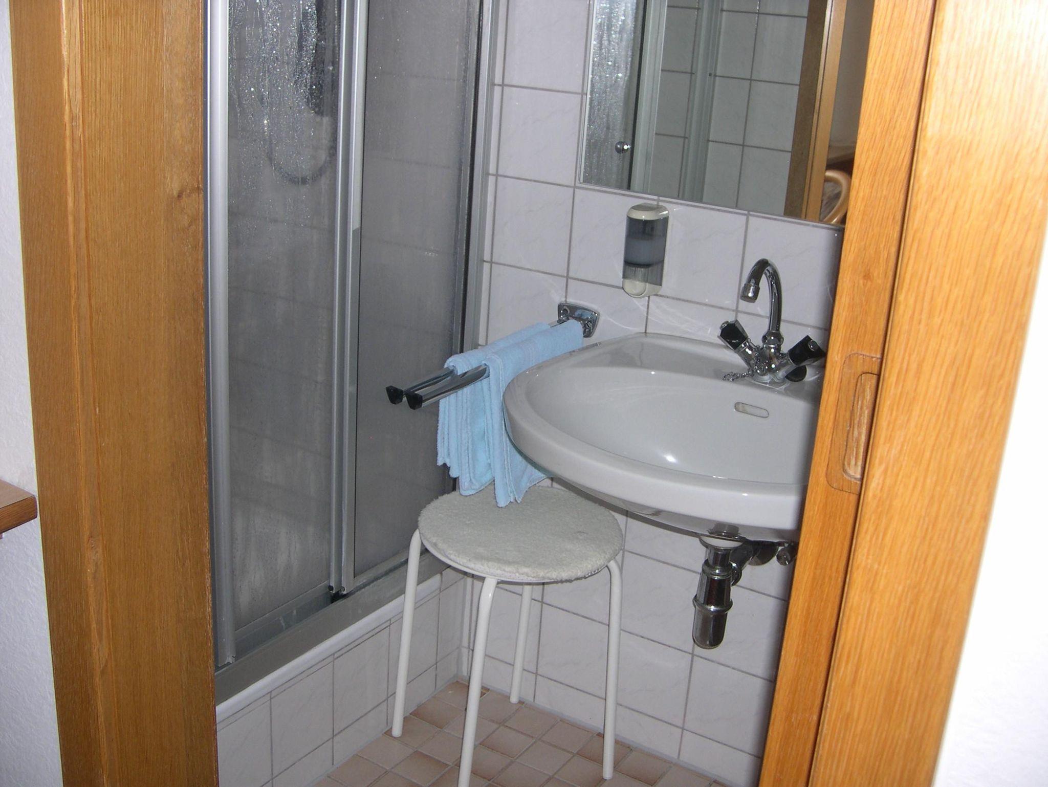 Sonstige Ausstattung: Duschgel, Seife, Kosmetikspiegel, Fön, Gästepantoffel.