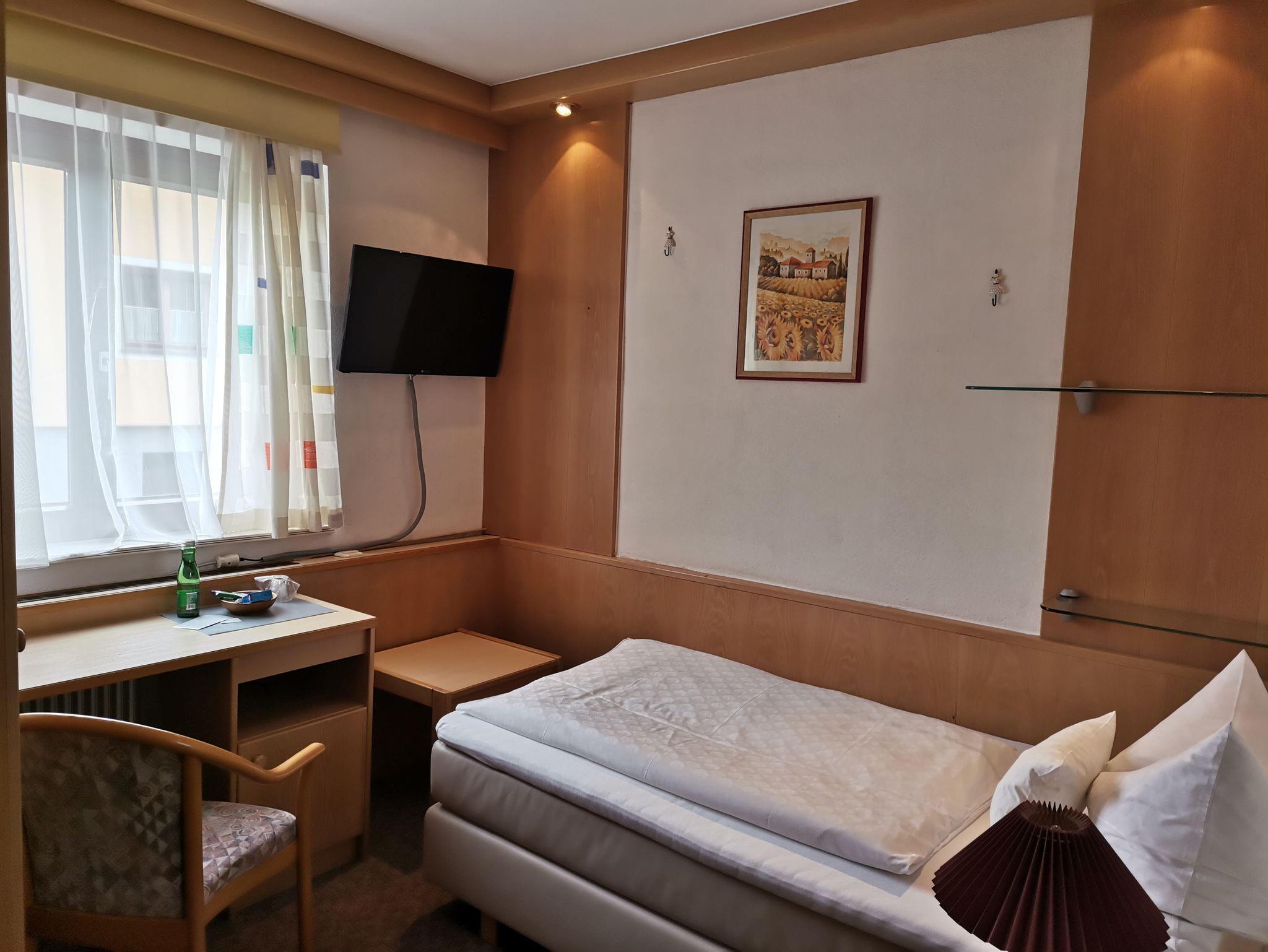 Günstiges, kleines Einbettzimmer im Erdgeschoß mit DU/WC, einen kleinen Sitzbereich, Sat-TV und kostenloses WLAN.