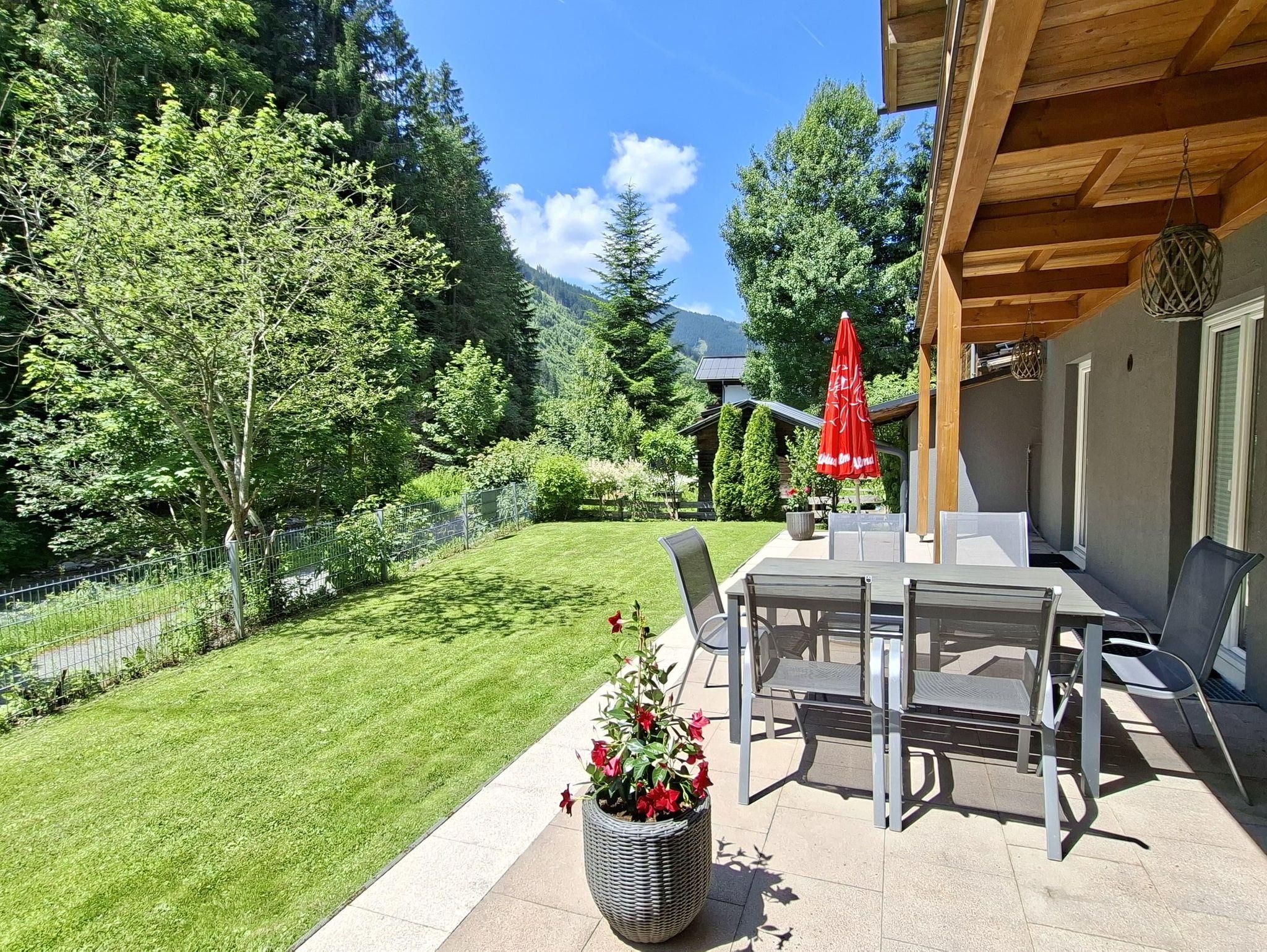 Von den sonnigen Balkonen oder Terrassen genießen Sie einen herrlichen Blick auf die umliegenden Berge, während ein idyllischer Bach hinter dem Haus für besondere Wohlfühlmomente sorgt.