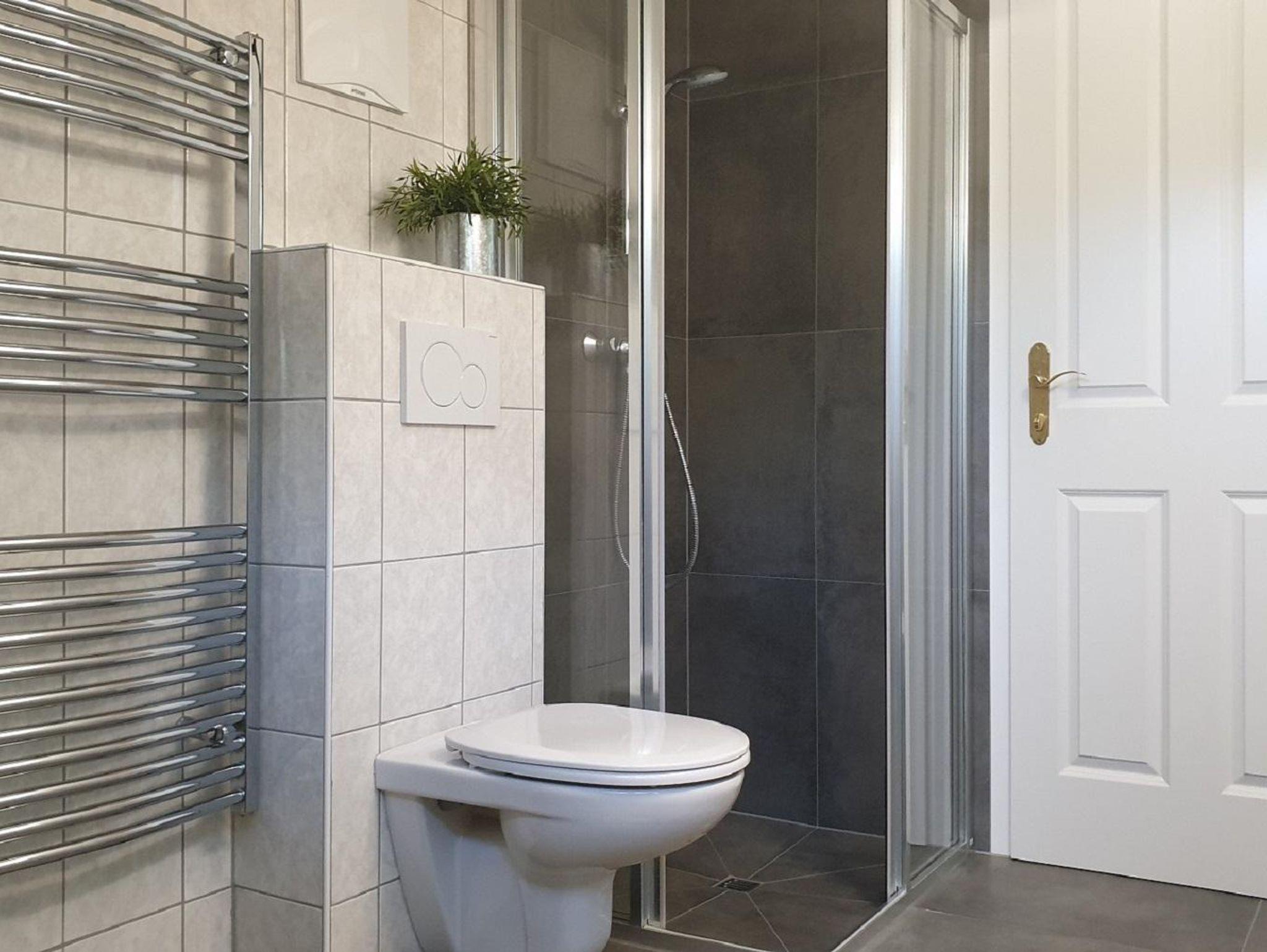 • Badezimmer mit Dusche, Waschbecken und Haartrockner;