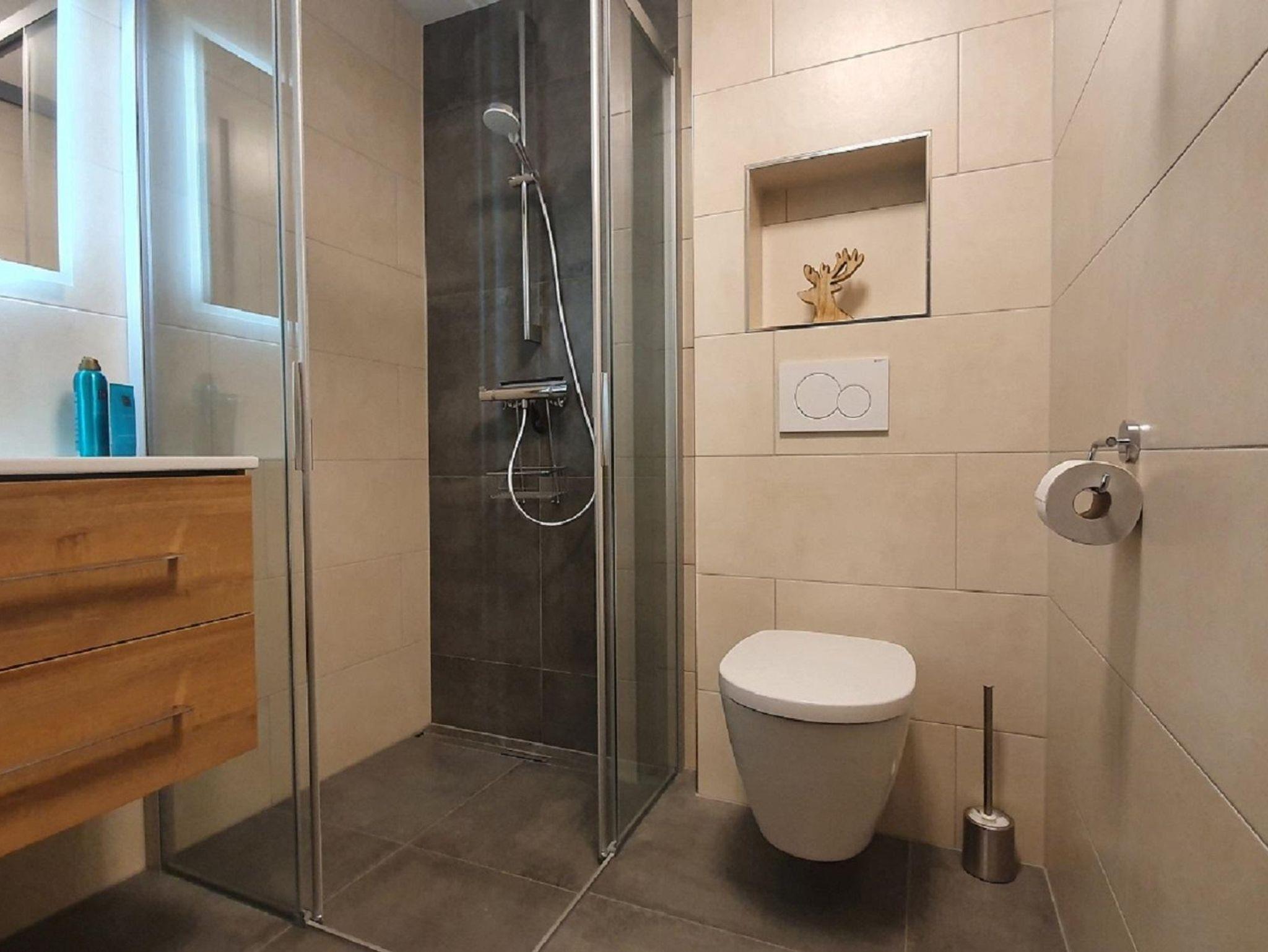 • Badezimmer mit Dusche, WC, Waschtisch und Haartrockner;