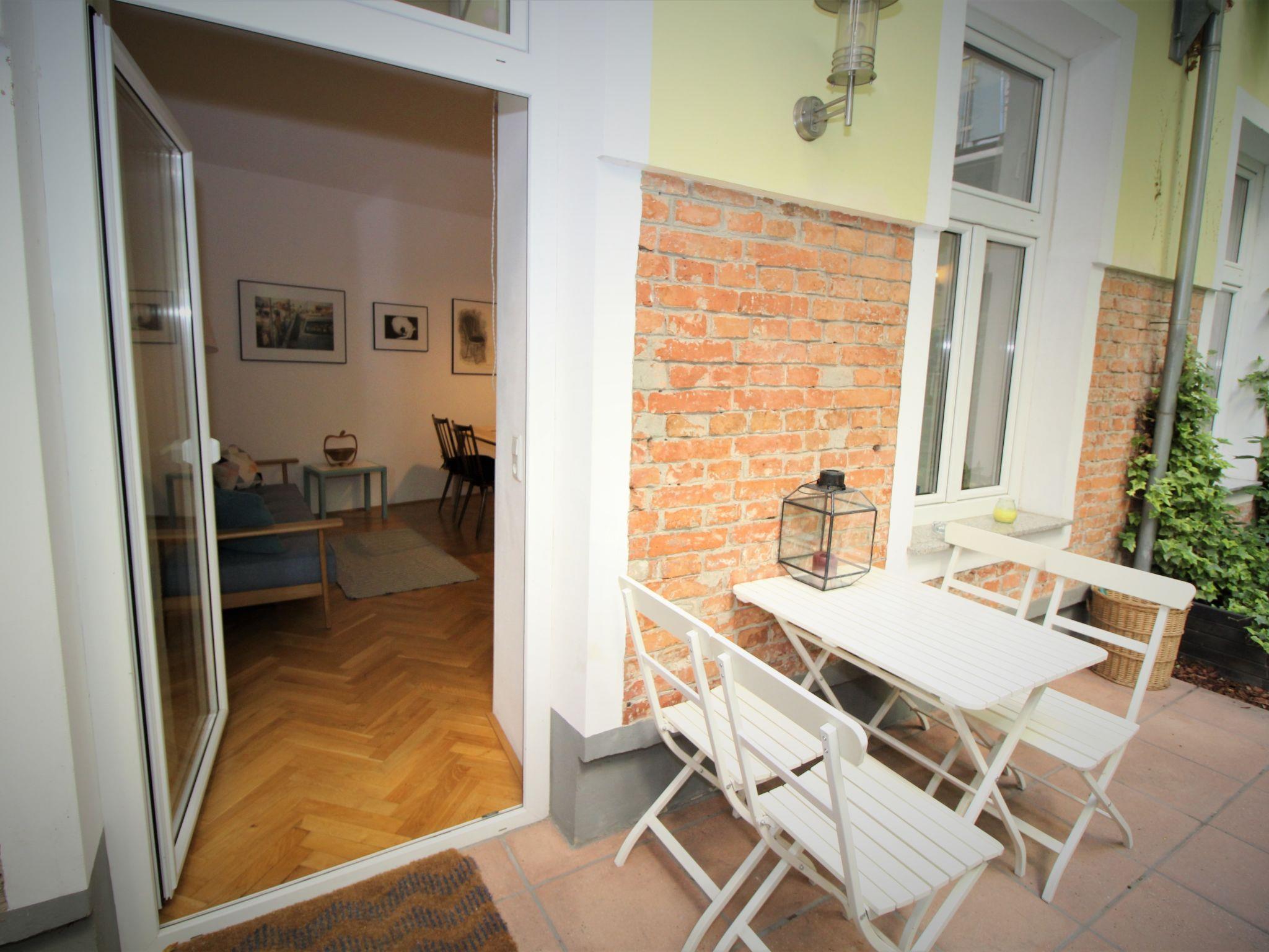 "City Oase Garden", 2-room apartment 43 m2, on the ground floor. Spacious, fully renovated in 2017, practical and modern furnishings: open entrance hall. 1 room with 1 double bed. Open large living/sleeping room with 1 double sofabed (120 cm, length 200 cm), dining table. Exit to the garden, to the terrace. Kitchen-/living room (oven, dishwasher, 4 ceramic glass hob hotplates, toaster, kettle, electric coffee machine). Bathroom, sep. WC. Parquet floors. Terrace, garden 50 m2. Terrace furniture. Facilities: washing machine, hair dryer. Internet (WiFi, free). Please note: suitable for families apartment courtyard side. Non-smokers only.