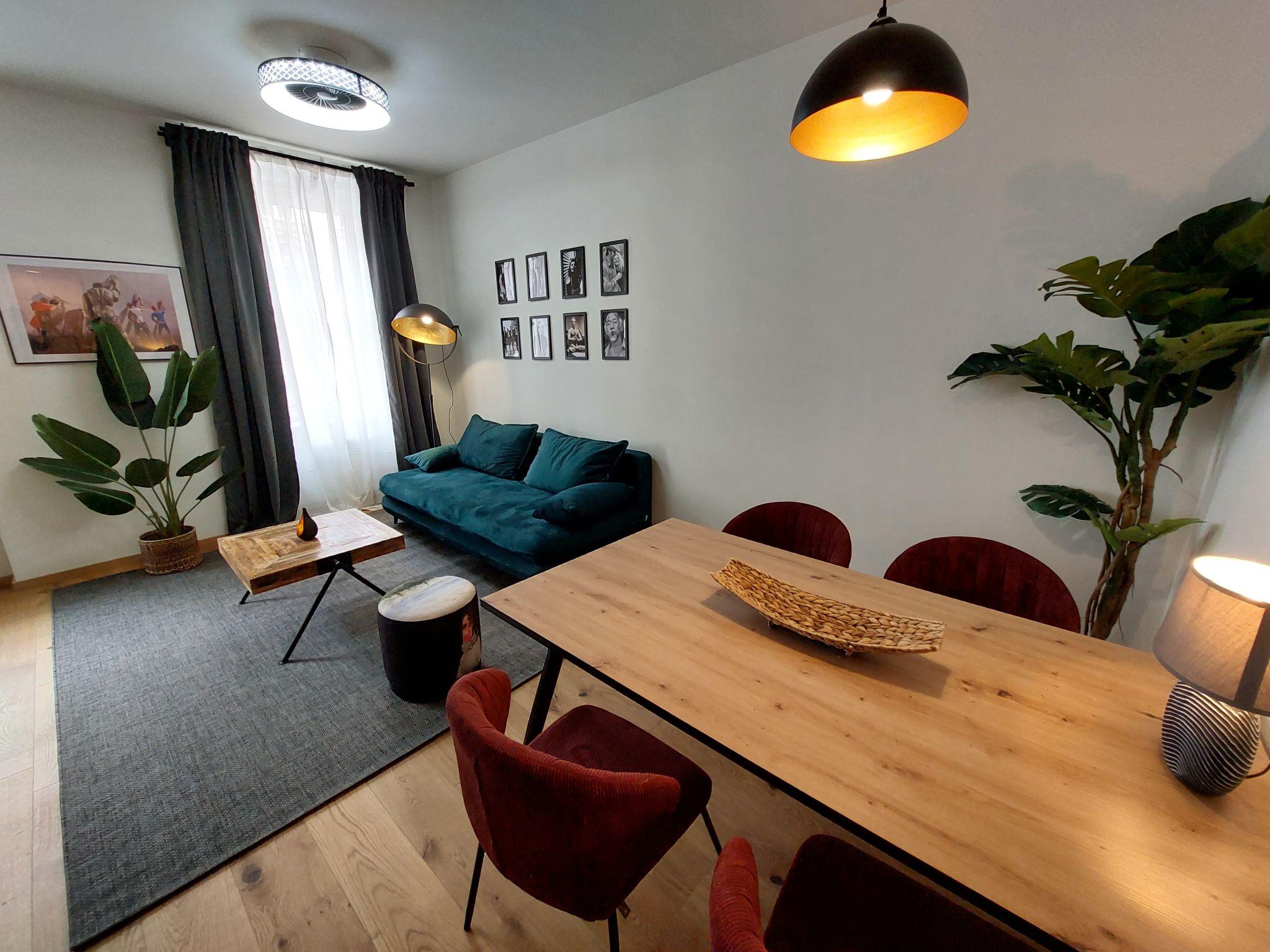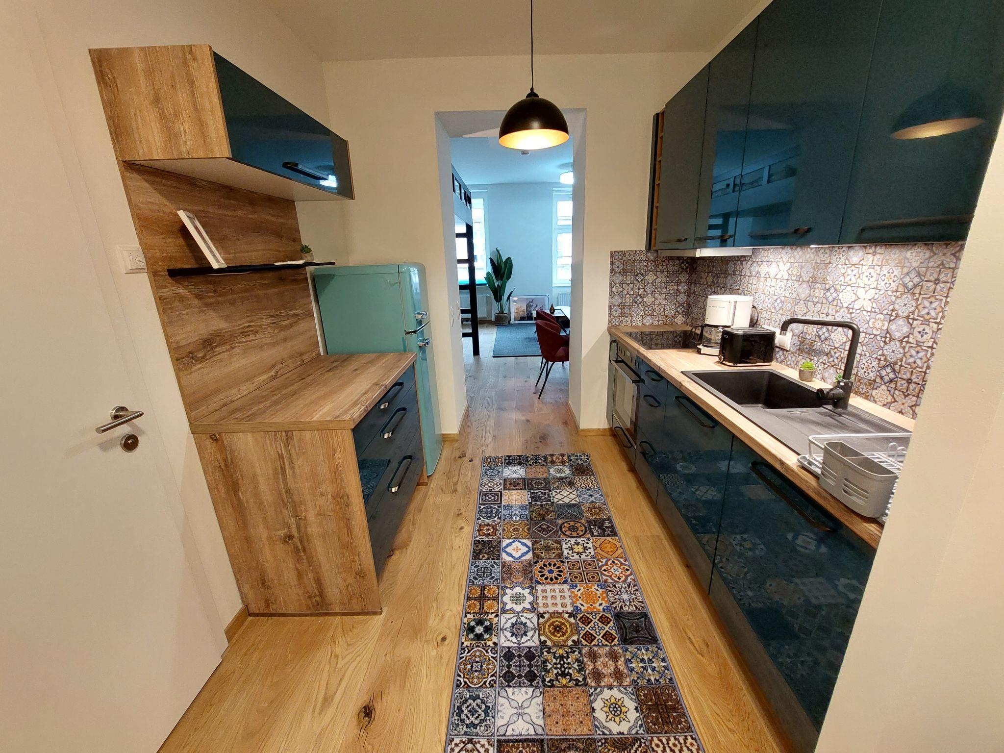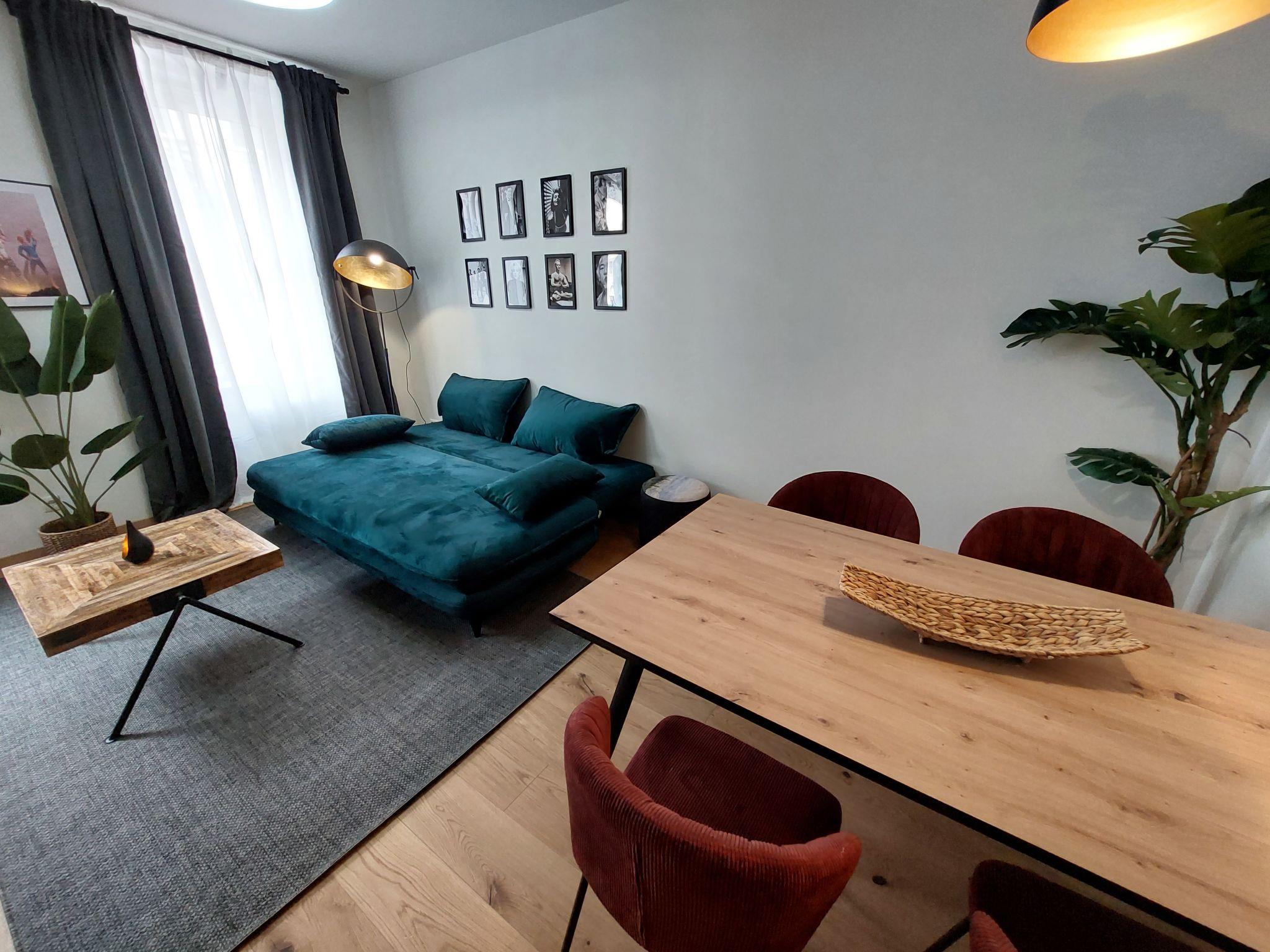 "Premium Apartment MariaHilf 2", 1-room apartment 42 m2 on 2nd floor. Object suitable for 4 adults. Bright, fully renovated in 2023, modern and tasteful furnishings: entrance hall. Open living/sleeping room with 1 x 1 bunk beds (150 cm, length 200 cm), 1 pull-out bed (2 pers.), cable TV, flat screen, radio, CD-player and fan. Kitchen in the entrance (4 hot plates, oven, dishwasher, toaster, kettle, electric coffee machine). Bath/WC. Heating. Wooden floors. Side view. Facilities: washing machine, iron, baby cot, hair dryer. Internet (WiFi, free). Please note: apartment street side. Non-smokers only. Double bed (150cm wide) is a loft bed. Highspeed-Internet.