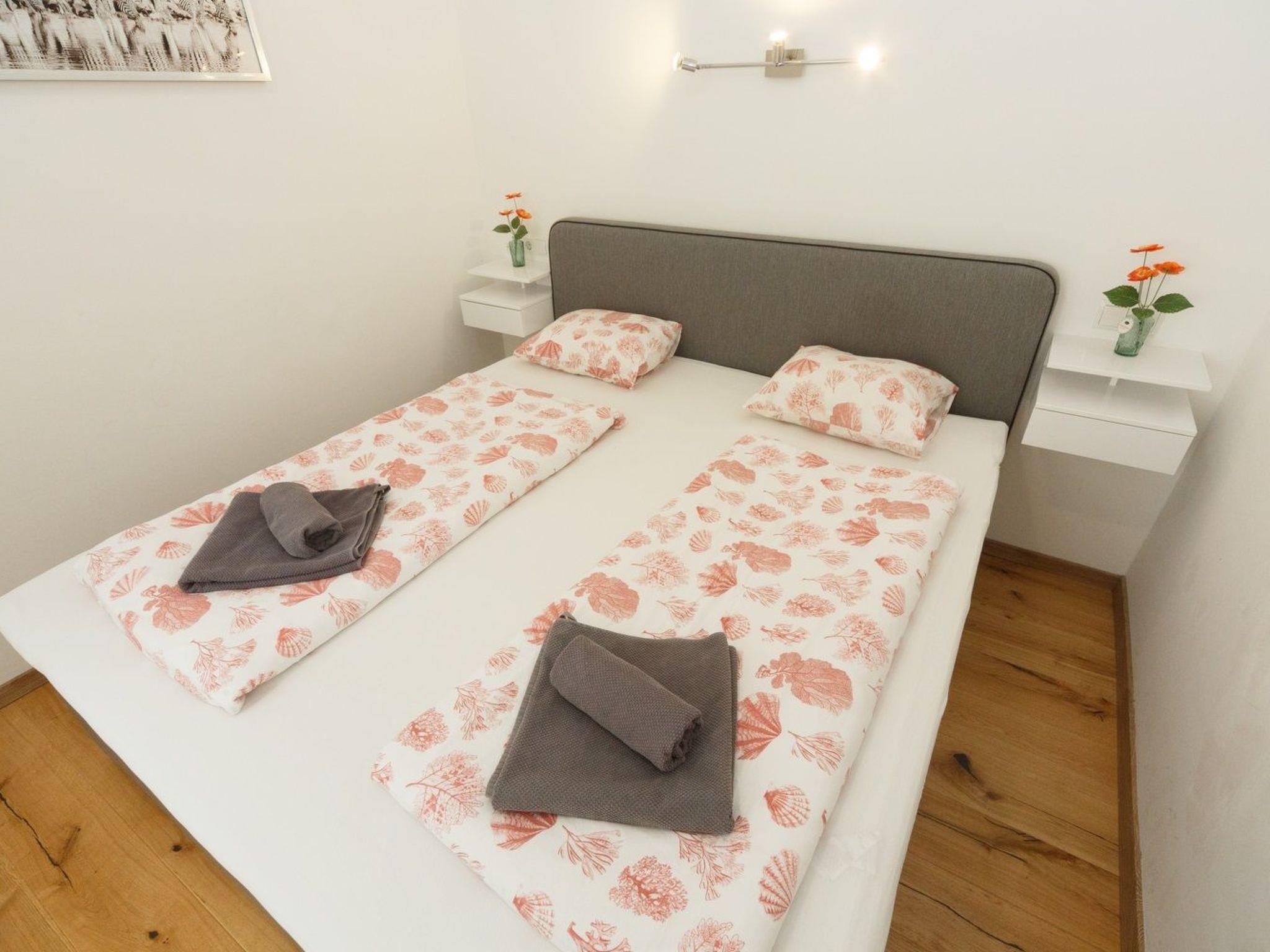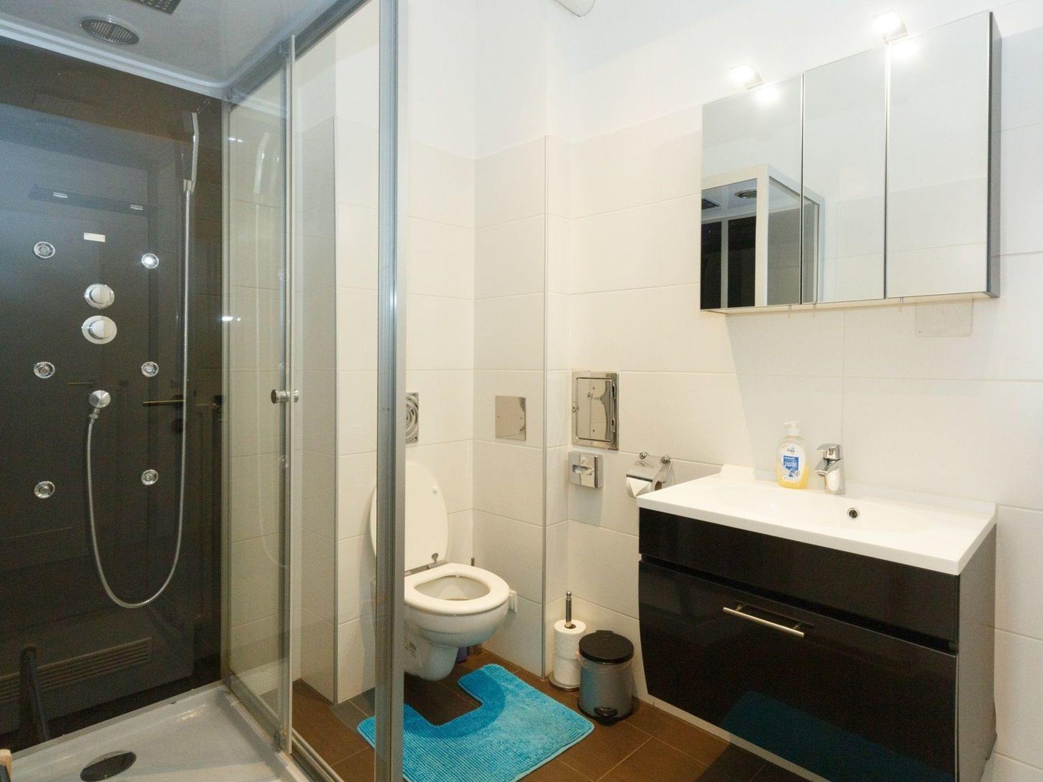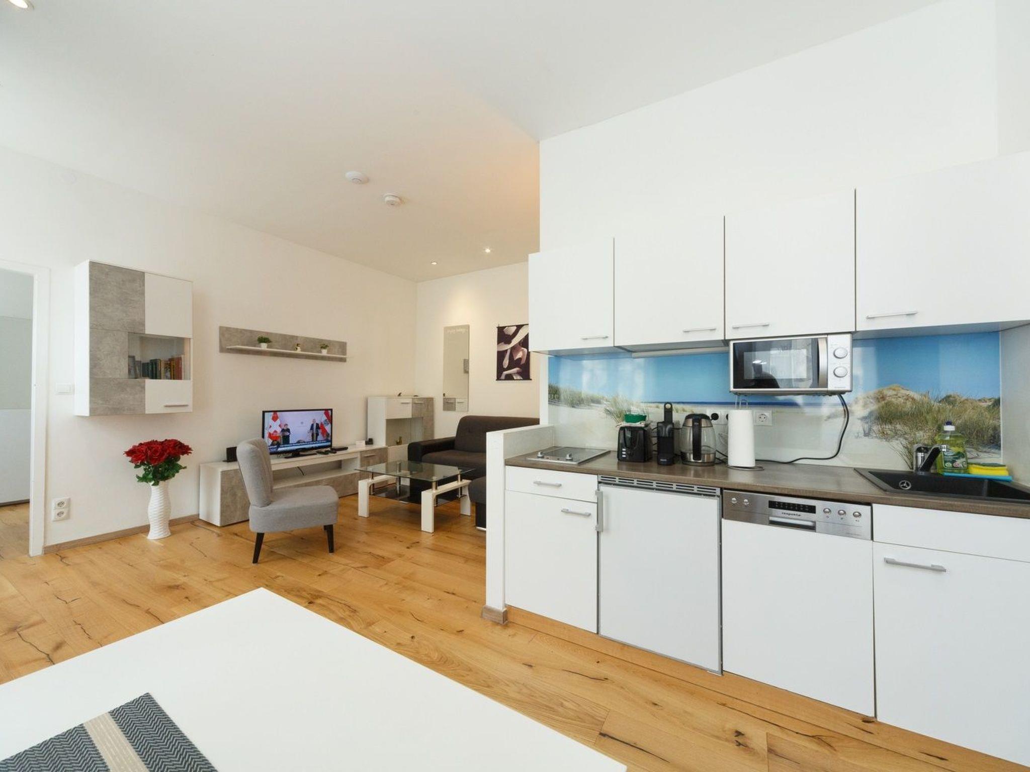 This flat is on the second floor and offers 45 m² of space for two people. The flat has laminate flooring and is divided into an entrance area, a bathroom with toilet, an eat-in kitchen and a bedroom. The living room has a sofa, coffee table, a living room cupboard and a dining area with a table and two chairs. The kitchen consists of a cooker, capsule coffee machine, microwave, fridge, sink and kettle. In the bathroom you have a shower, a toilet and a washbasin at your disposal, the bedroom consists of a box spring bed with bedside table and a spacious wardrobe.