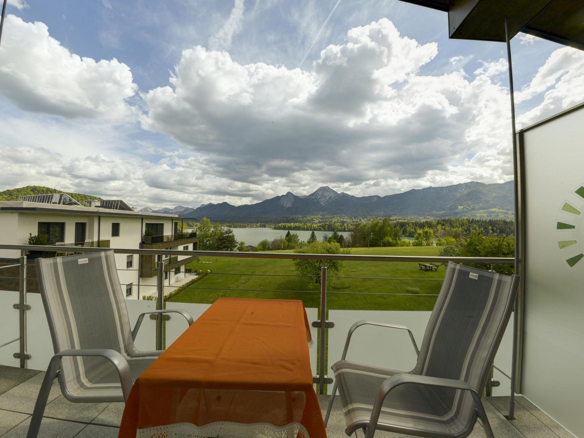 Komplett neue Ferienwohnung im Haus Mittagskogel mit Wohnschlafraum, Südbalkon und Seeblick, herrlichen Panoramablick, im 1.und 2.Stock, modern eingerichtet mit hellen Holzmöbel und Holzfußböden, große Dusche/WC, Kochnische im Vorraum, Bett- und Tischwäsche, Handtücher, Haustelefon, Radio, SatTV, WLAN,Tresor, Sonnenschirm.....