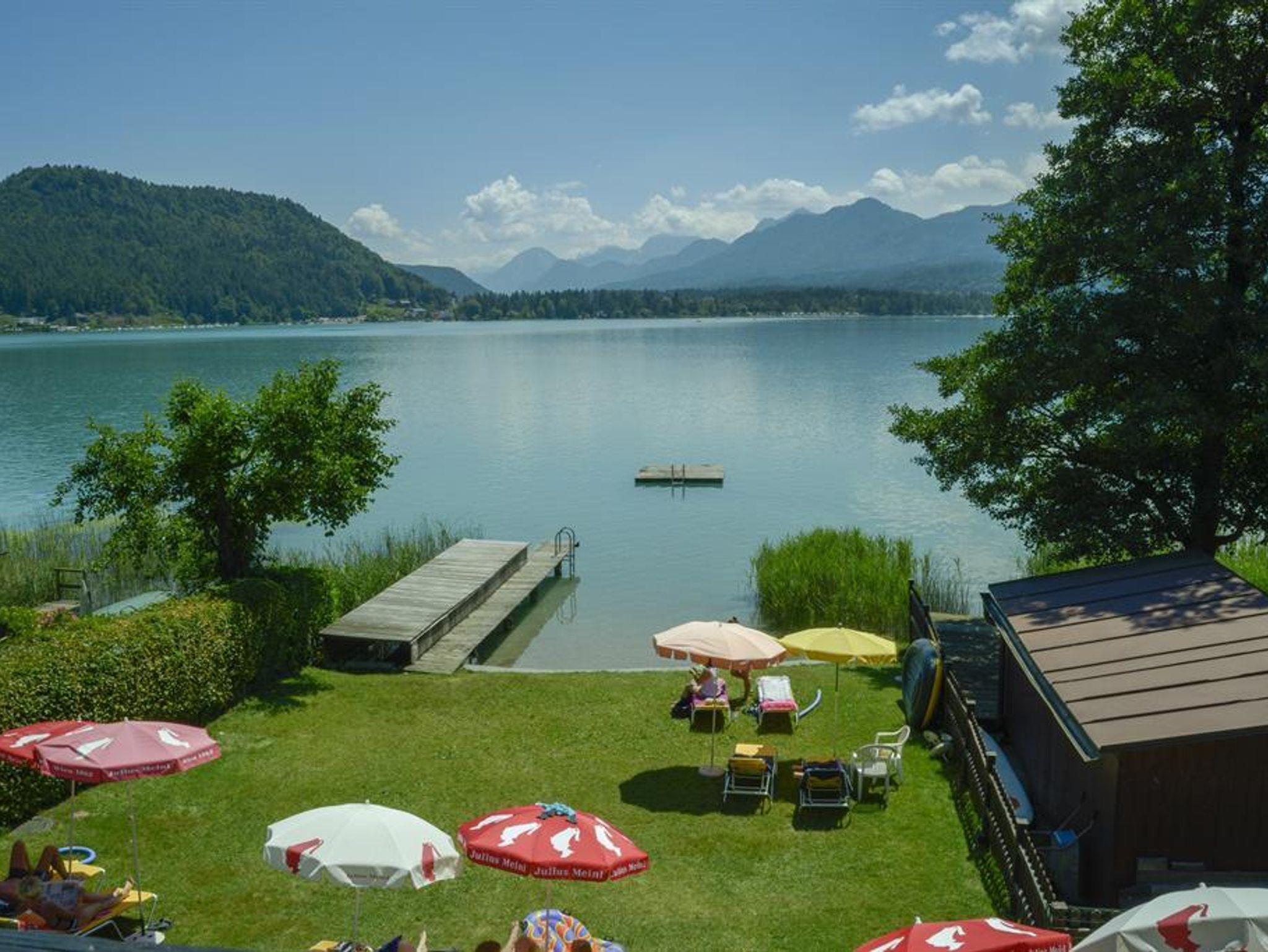 Komplett neue Ferienwohnung im Haus Mittagskogel mit Wohnschlafraum + 1Schlafzimmer, Südostterrasse und etwas Seeblick im 1. Stock, modern eingerichtet mit hellen Holzmöbel und Holzfußböden, große Dusche/WC, große Küche mit Geschirrspüler und Mikrowelle, Bett- und Tischwäsche, Handtücher, Haustelefon, Radio,SatTV in jedem Zimmer, WLAN, Tresor, Sonnenschirm