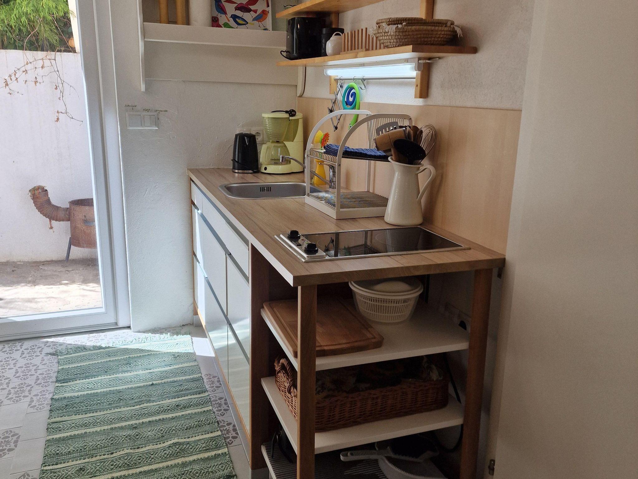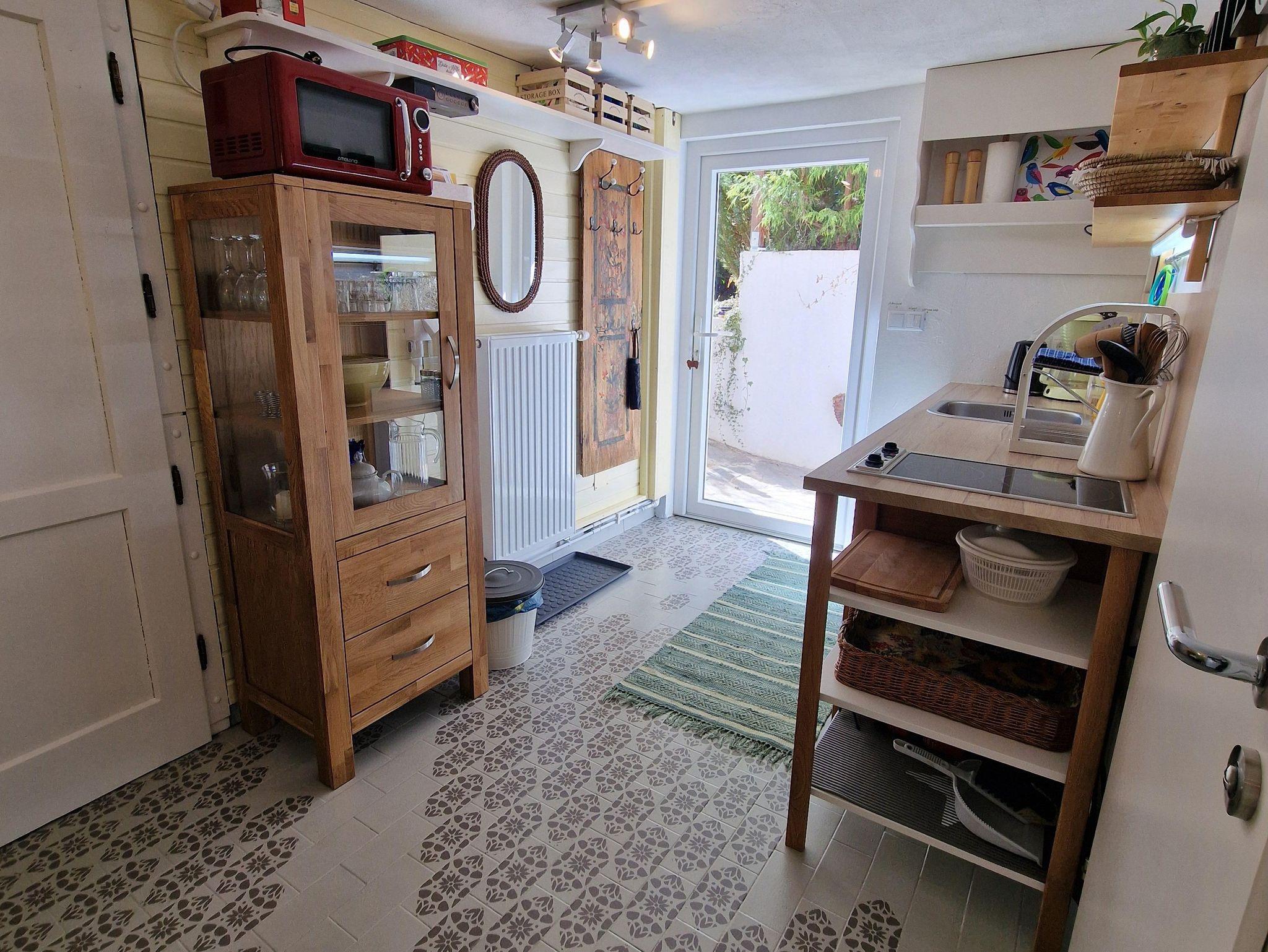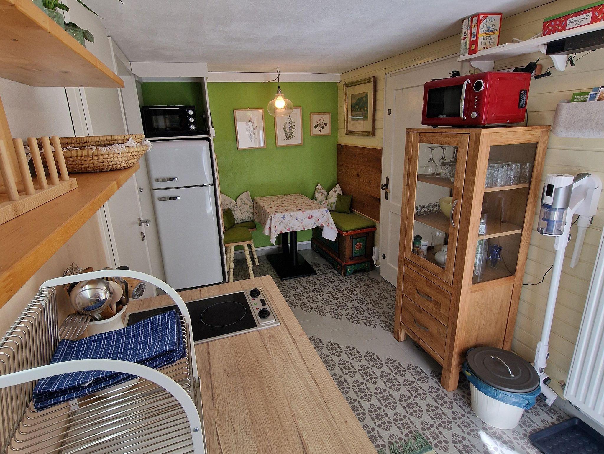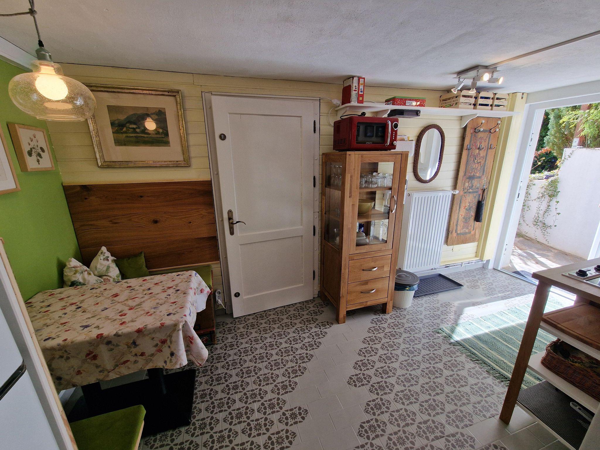 Vom überdachten Parkplatz gelangt man von außen zum Eingang der Wohneinheit. Der Eingangsbereich ist gleichzeitig die Küche mit einem kleinen Essbereich. Die Küche ist zweckmäßig eingerichtet und bietet den Komfort einer Singleküche.