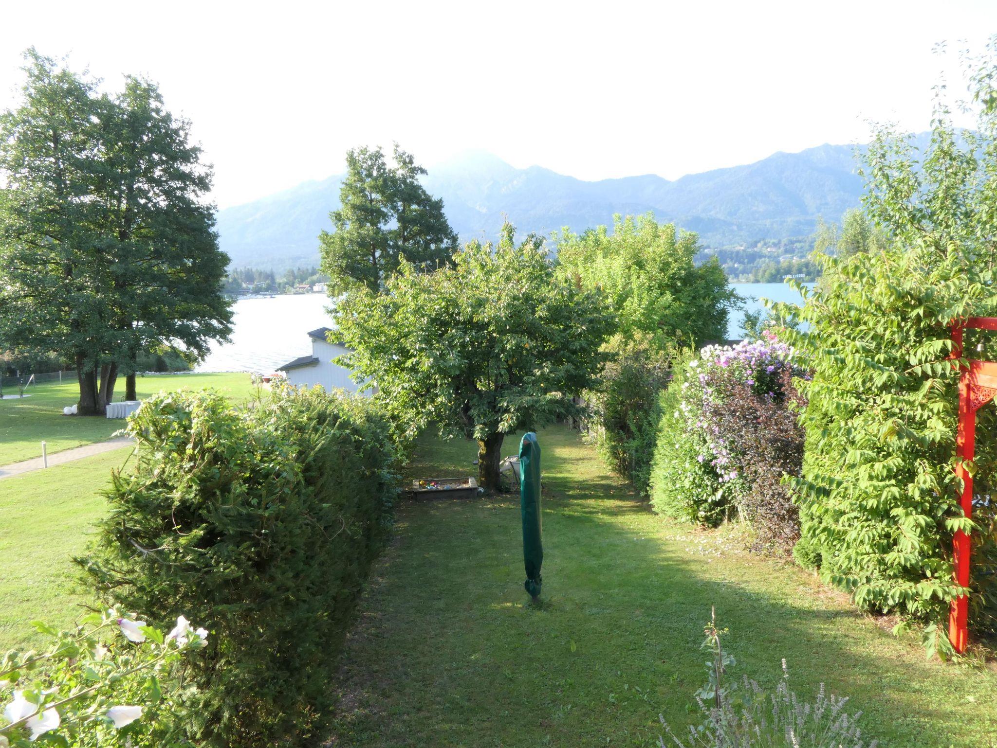 Von der Terrasse aus haben Sie einen herrlichen Blick auf die Karawanken mit dem majestätischen Mittagskogel, der über dem türkisblauen Wasser des Sees thront. Diese Aussicht macht den Aufenthalt besonders erholsam und unvergesslich.