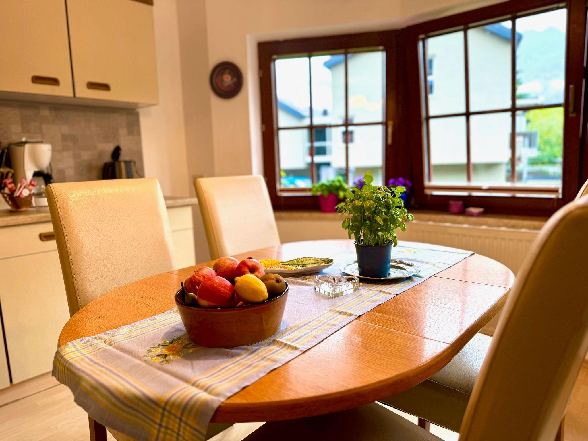 54 m² Appartement für 2 - 4 Personen. 1 Schlafzimmer mit Doppelbett, 1 Schlafzimmer mit französischem Bett, Wohnküche - komplett ausgestattet, Wohnzimmer, DU/WC, SAT-TV, Zugang zur Terrasse u. Garten, NEU! Gratis Glasfaser Fiber Speed 750/100 Mbit/s.