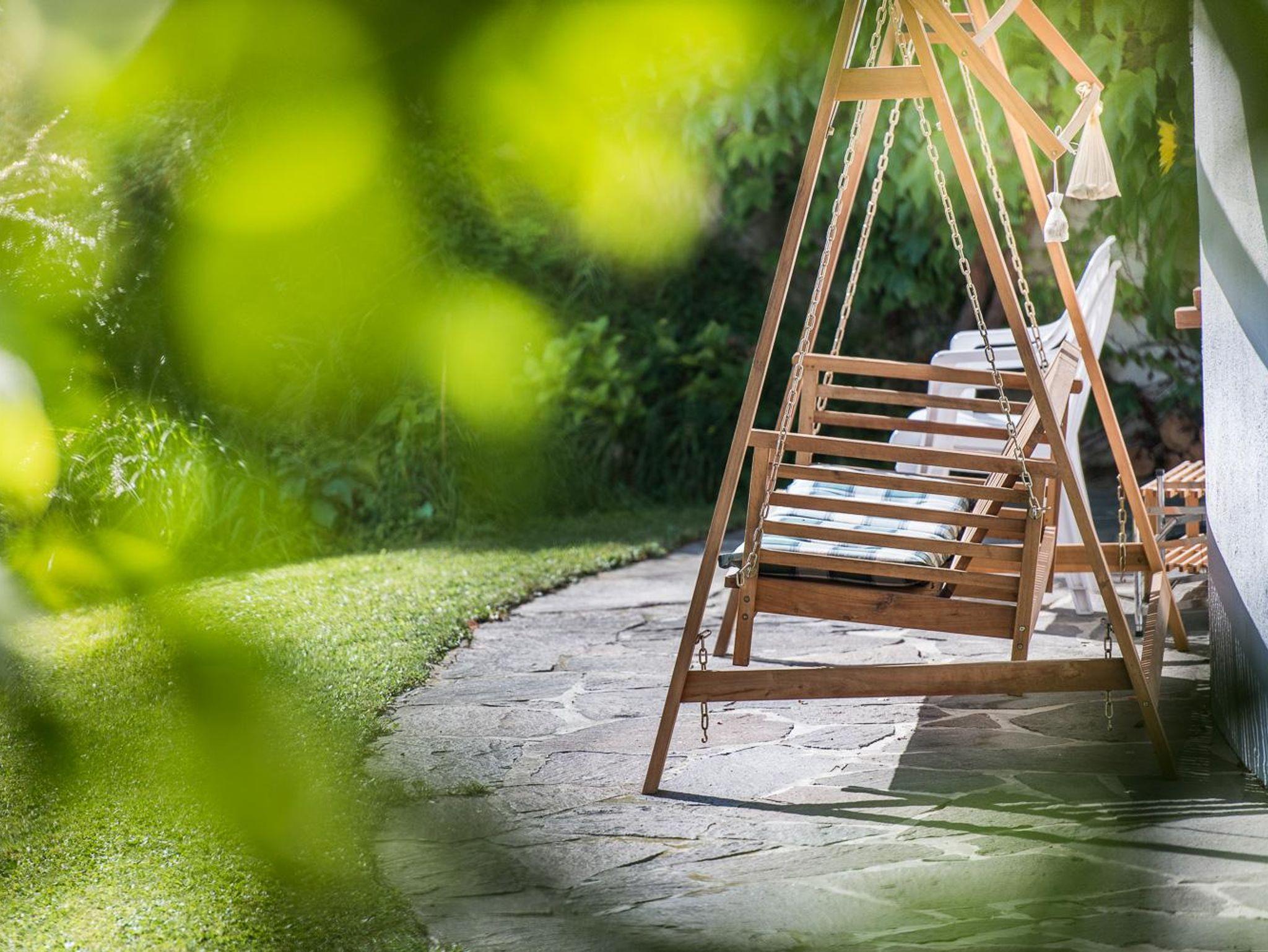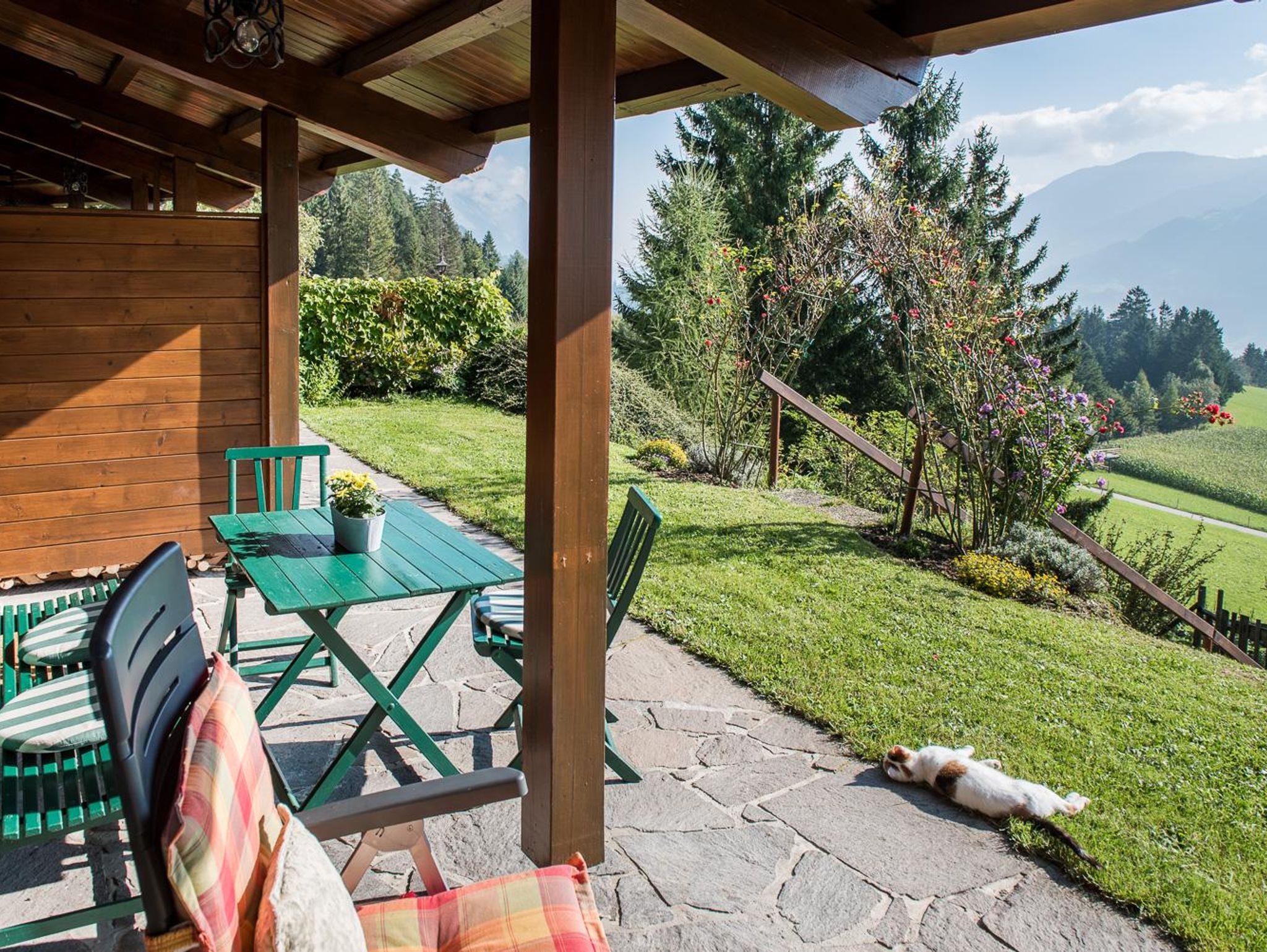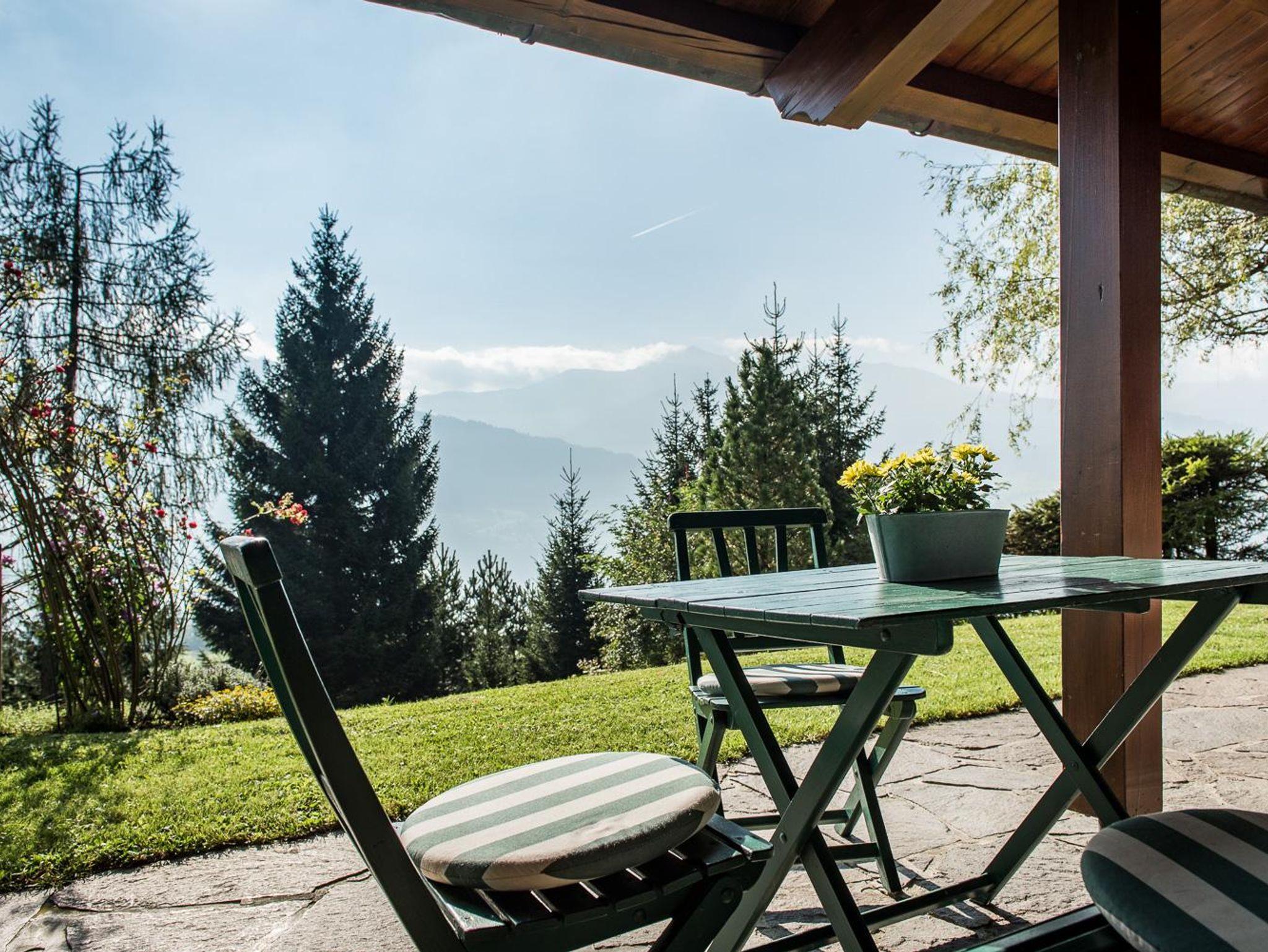 Im Aussenbereich Sitzmöglichkeit und Wiese mit herrlicher Talsicht