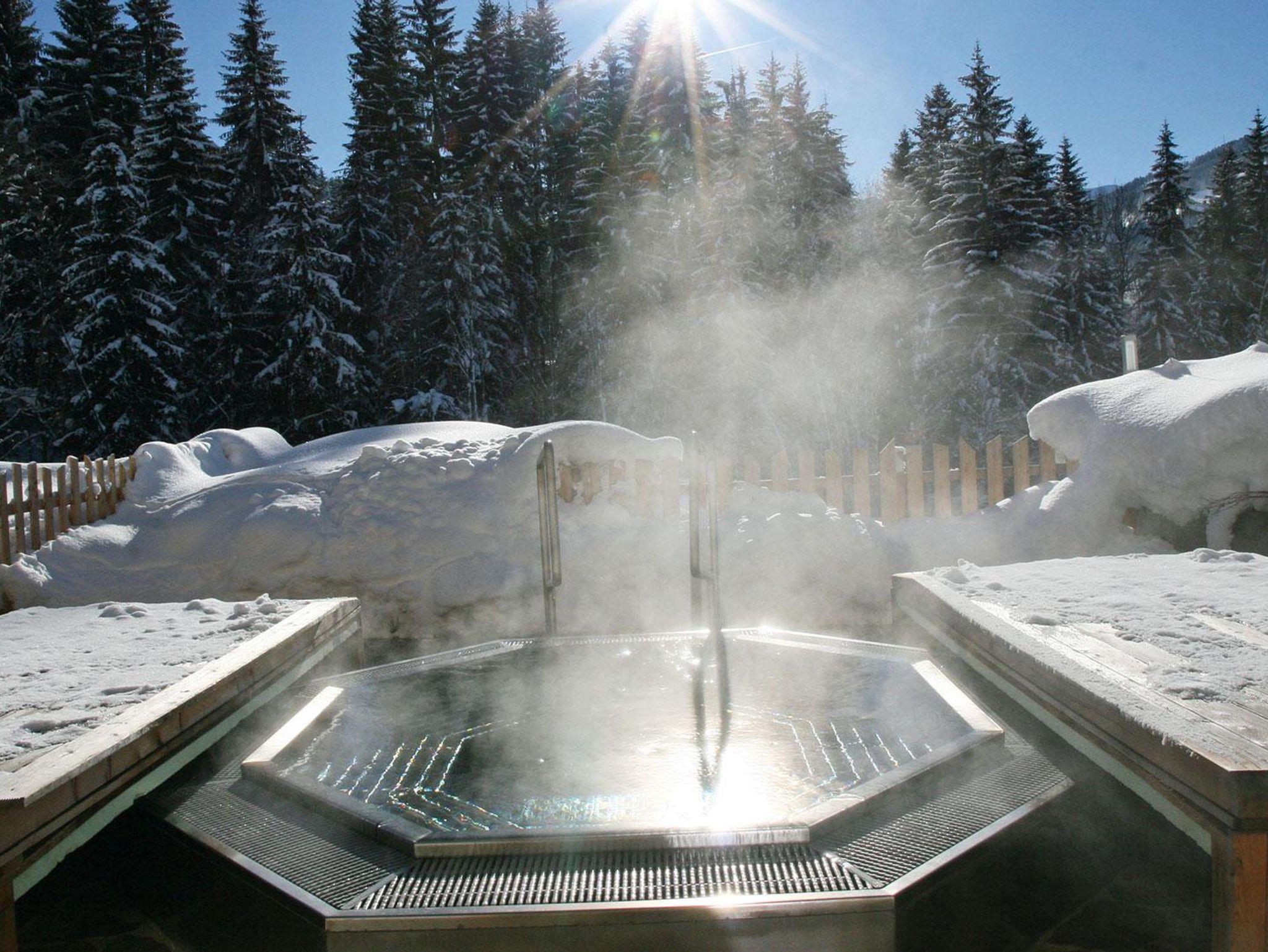 Im Sommer der beheizte Swimmingpool und im Winter das entspannende Whirlpool auf der grossen Gemeinschaftsterrasse.