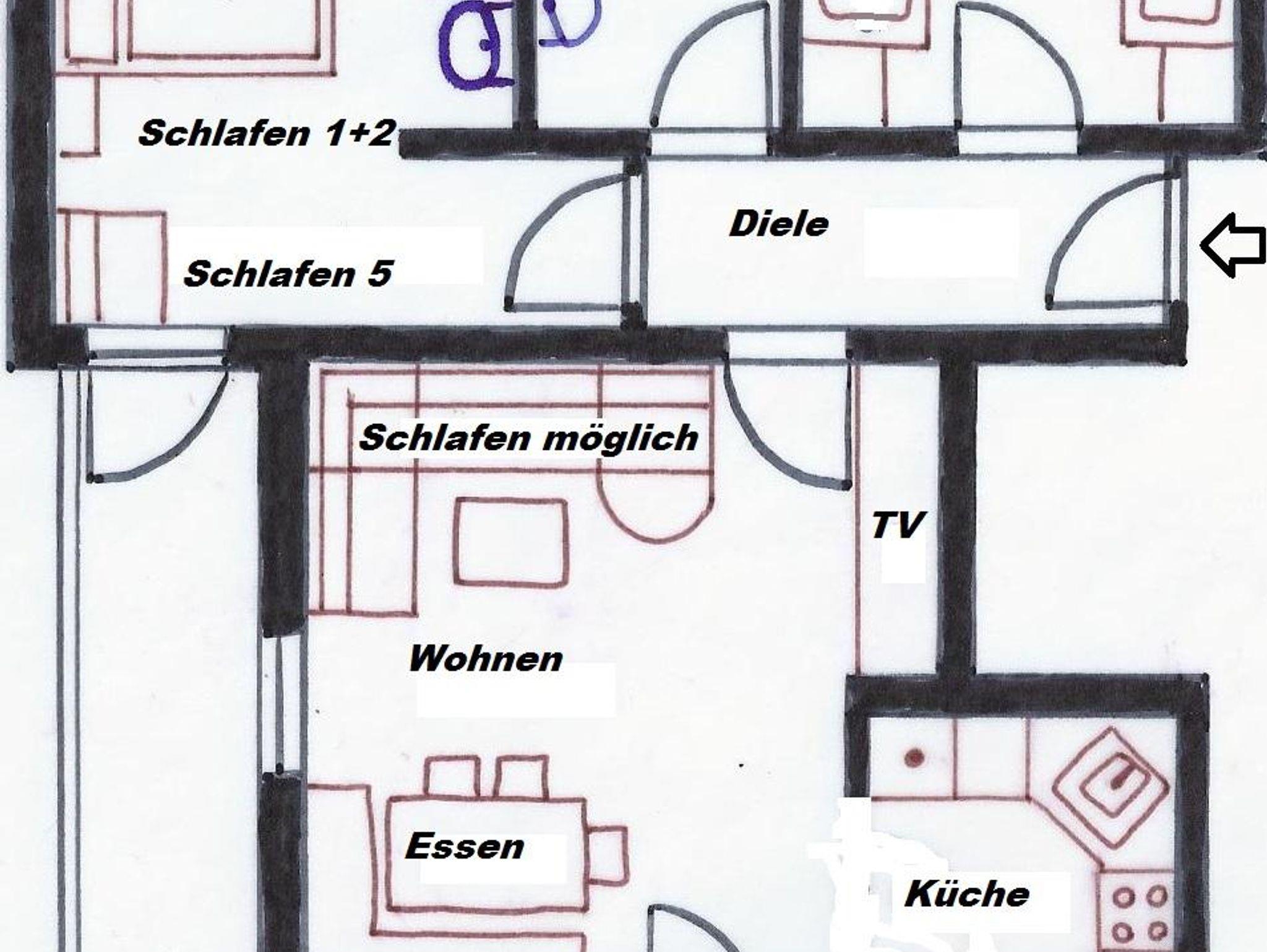 2 separate Schlafräume (1xDoppelbett, 2xEinzelbett) Wohnraum, Sofabett für 1 Person, TV, Esstisch, Küche: Ceran-Kochfeld, Backofen, Mikrowelle, Spülmaschine, Kühl-/Gefrierschrank, Kaffeemaschine, Eier-/Wasserkocher, Toaster