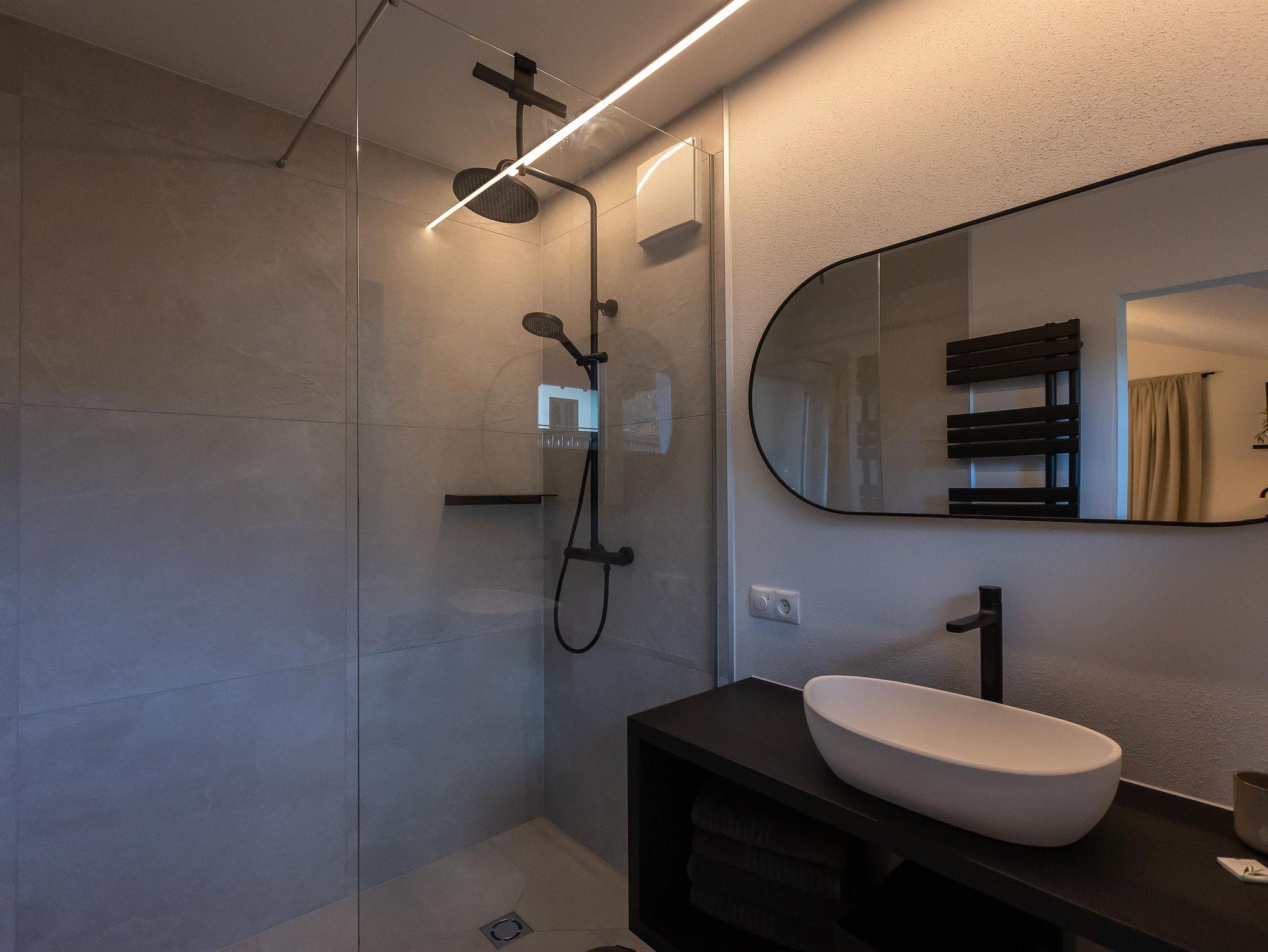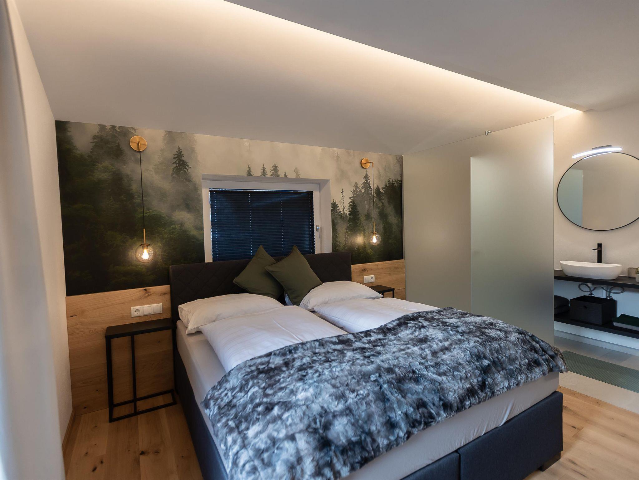 Unser Deluxe Apartment Snowy für 2-3 Personen verfügt über ein komfortables Boxspringbett, offens Badezimmer mit Regendusche, moderne eingerichtete Küchenzeile, Essbereich, Schlafcouch, Balkon, großer Smart TV, WIFI, seperates WC.
