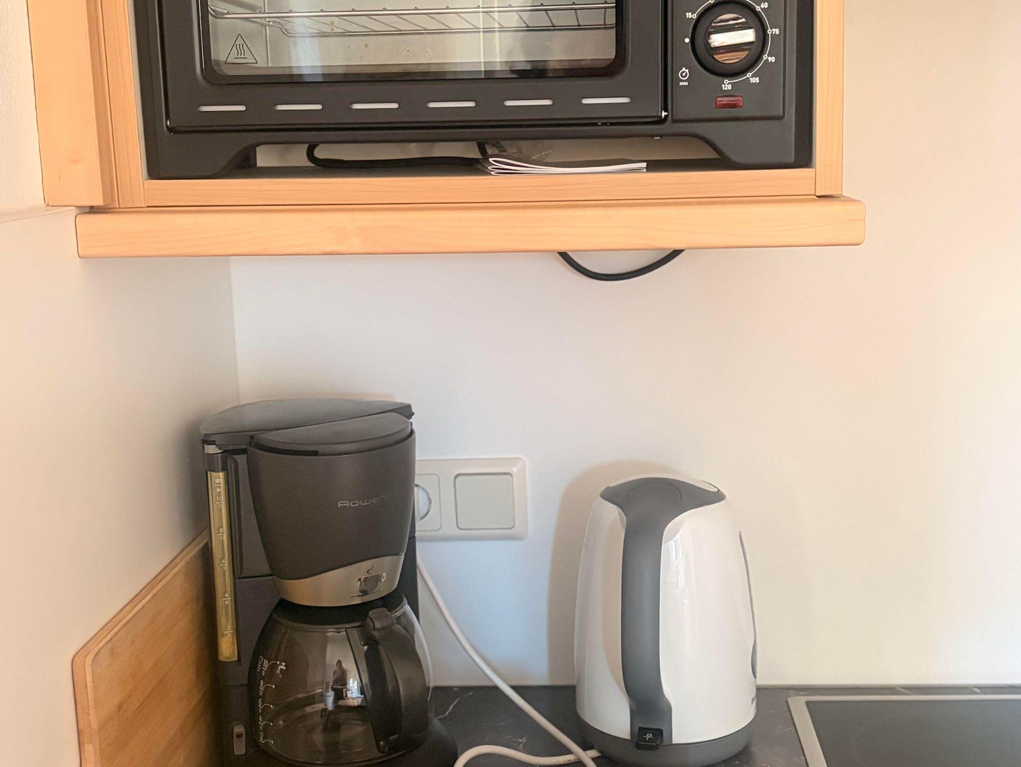 1 Schlaraum Doppelbett (1,80x2,00m), 1 innenliegender Schlafraum 2xEinzel-Hochbett (0,90x1,90m), Wohnraum, TV, Esstisch, Kombigerät:Backofen-Mikrowelle, Spülmaschine, Kühlschrank, Kaffeemaschine, Eier-/Wasserkocher, Toaster