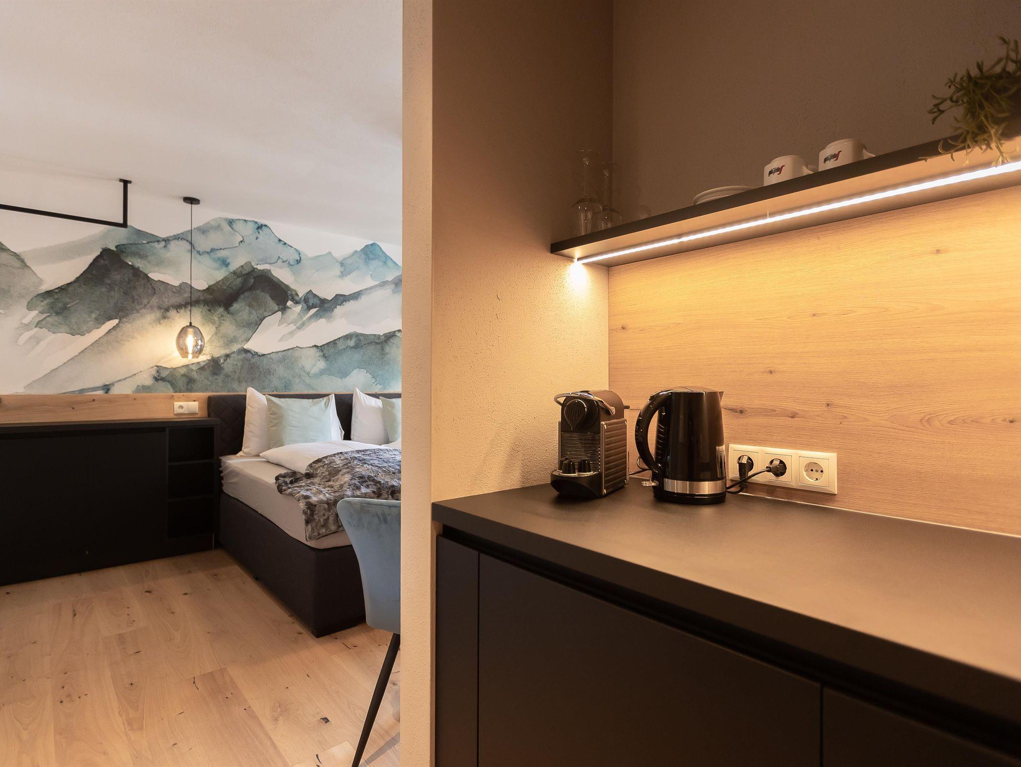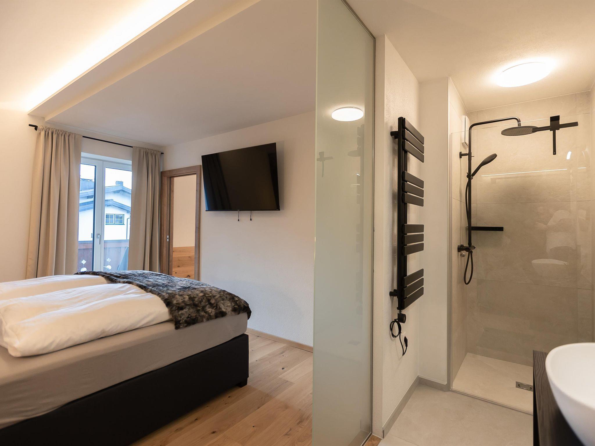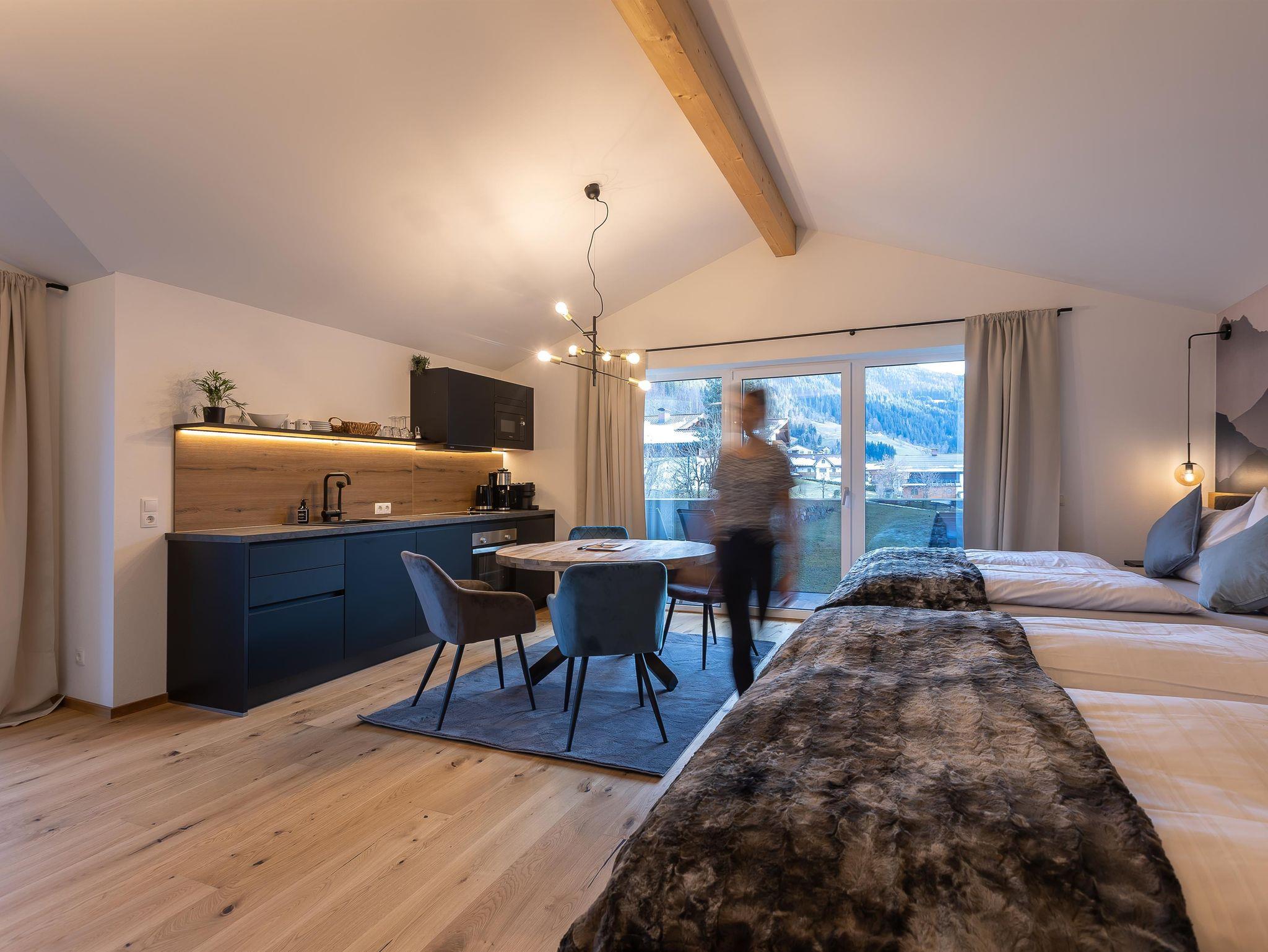 Unser Mountainy & Watery - Apartment mit Bergblick ist ideal für Familien und Freunde, verfügt über 2 getrennte Schlafzimmer mit komfortablen Boxspringbetten, 2 Bäder mit Regendusche, moderne Küchenzeile, Teeküche, großer Essbereich, 2 Balkon, WIFI.