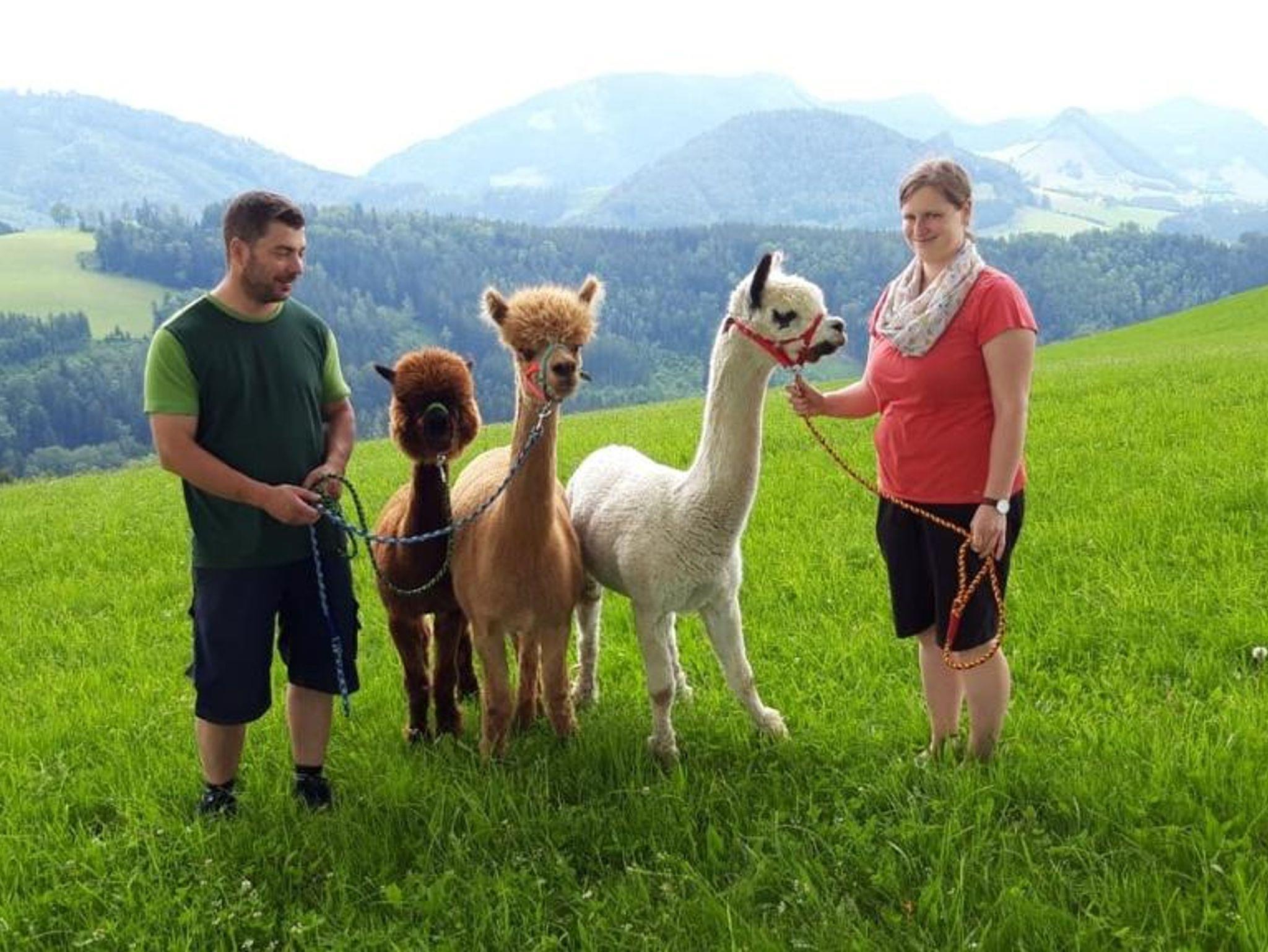 Sanftmütige Alpakas leben auf dem Hof und können bei geführten Wanderungen begleitet werden. Zudem sind hochwertige Alpakaprodukte wie Decken, Schuheinlagen und Wolle erhältlich.