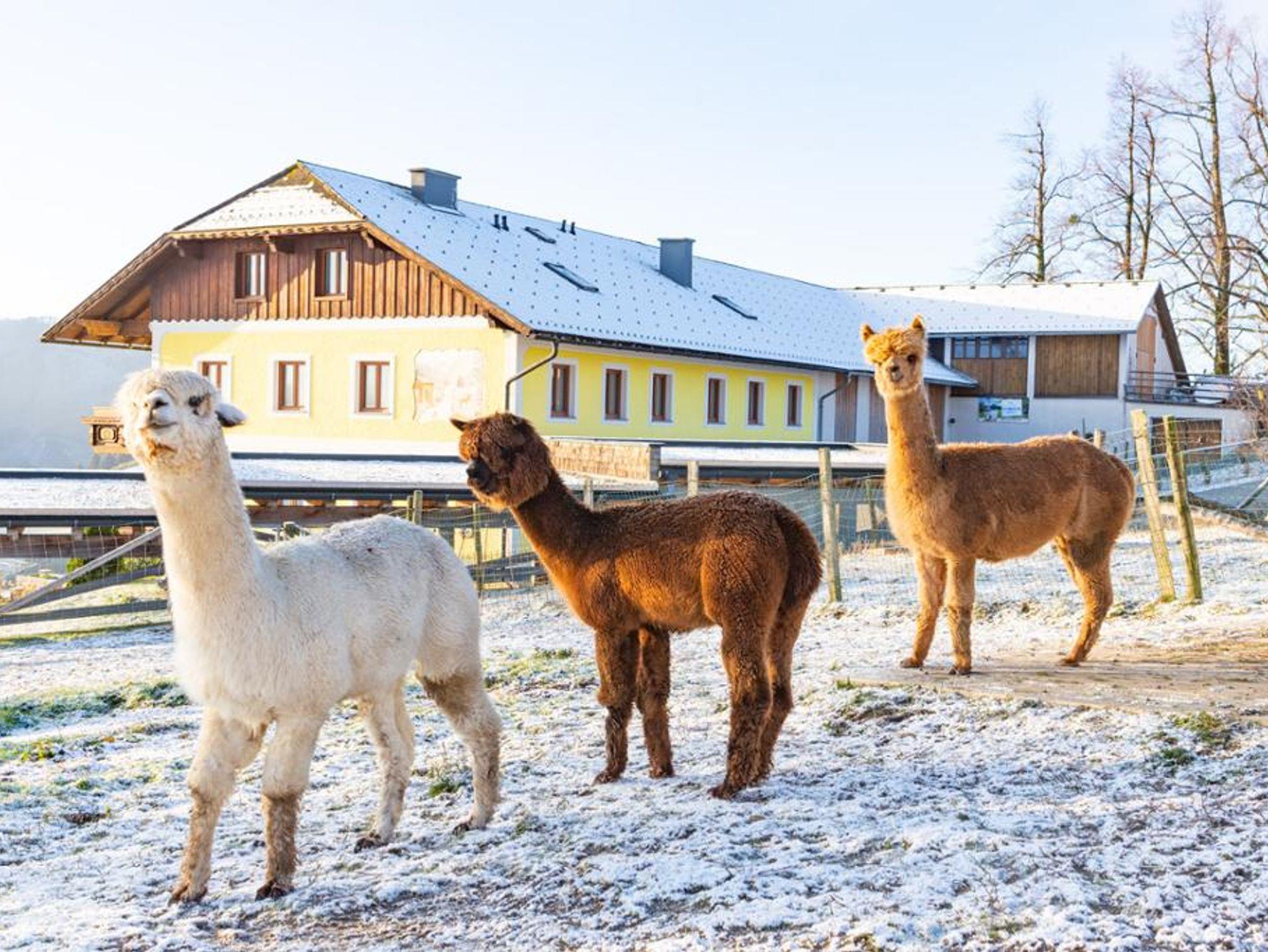 Sanftmütige Alpakas leben auf dem Hof und können bei geführten Wanderungen begleitet werden. Zudem sind hochwertige Alpakaprodukte wie Decken, Schuheinlagen und Wolle erhältlich.
