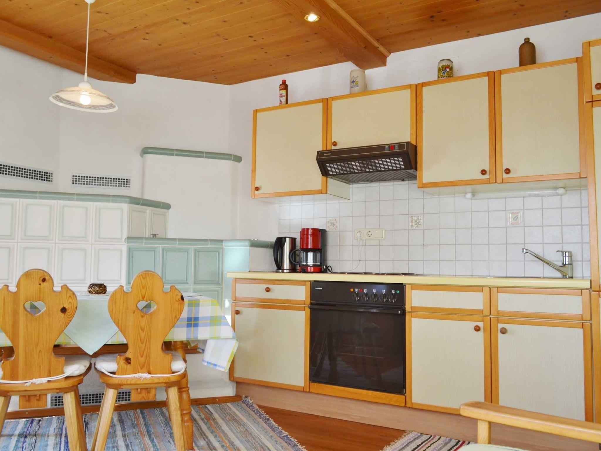 - gemütlicher Wohnraum mit Kachelofen und ausziehbarer Schlafcouch für 2 Personen