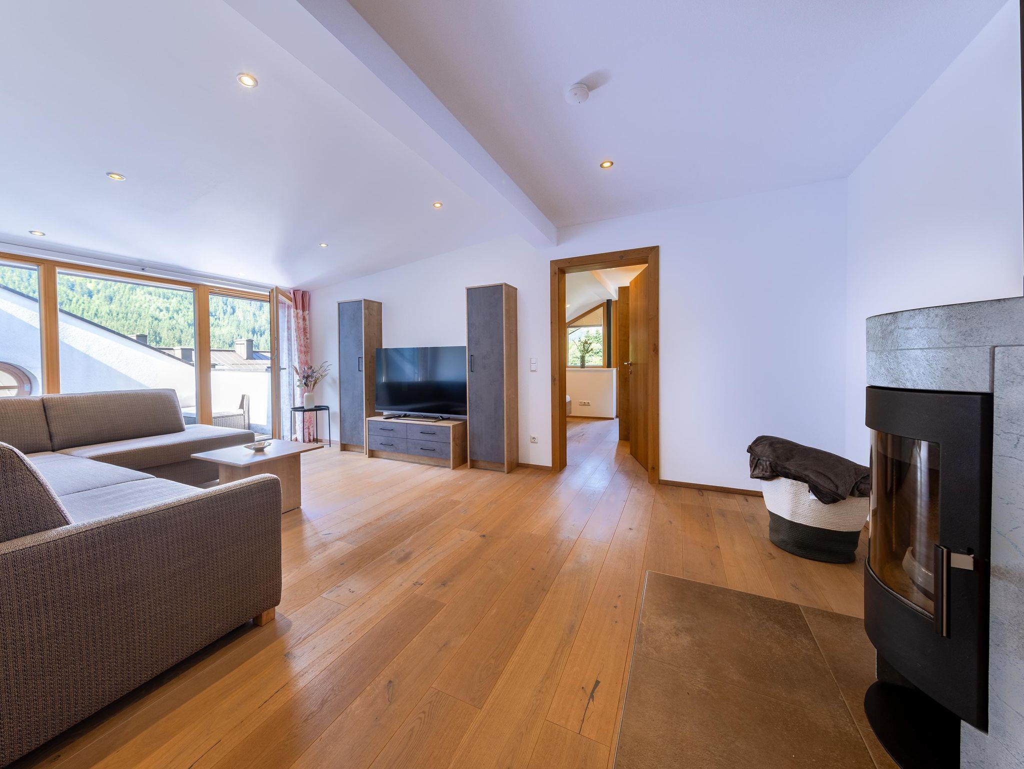 Unsere 115 m² große Ferienwohnung verfügt über eine geräumige Terrasse und einen Balkon mit atemberaubendem Bergblick. Entspanne vor dem Holzofen oder nutze die Doppelschlafcouch und den Fernseher für gemütliche Abende.