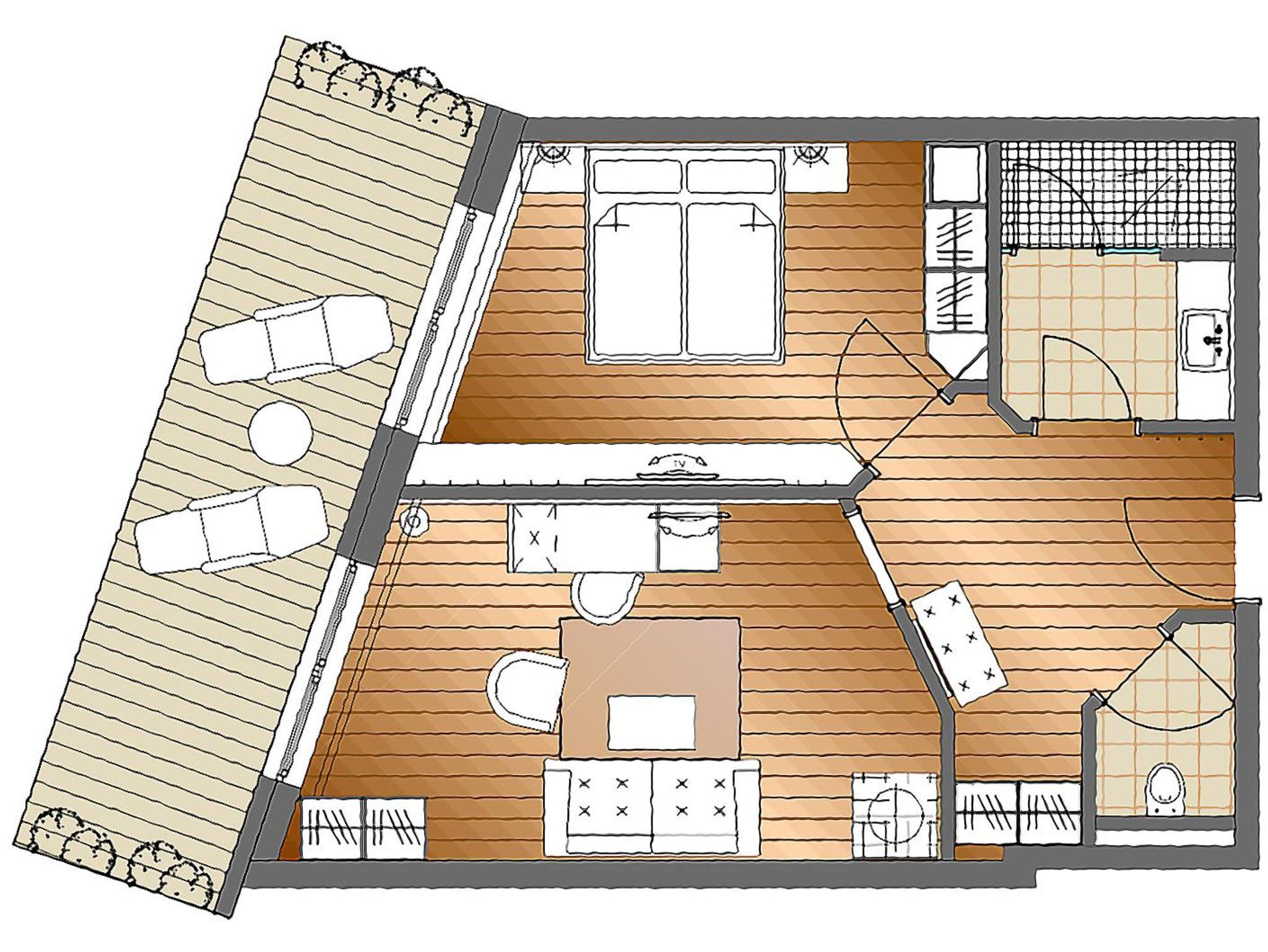 Eine komfortabel eingerichtete Suite, ca. 40-45m² groß, für 2-4 Personen mit Holzfußboden und hochwertigen Naturholzmöbeln. Auch für 3 oder 4 Personen ist hier genug Platz, da Wohnzimmer und Schlafzimmer komplett voneinander getrennt sind. Das ausziehbare Schlafsofa verfügt über eine gute Matratze, so dass auch die 3. und 4. Person gut schlafen können.