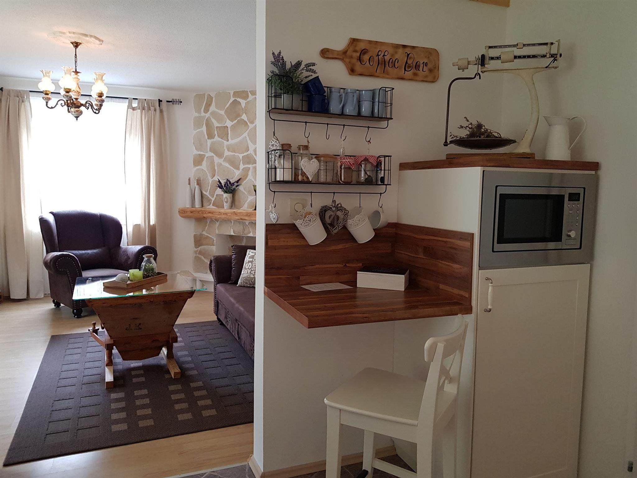 In der Küche ist viel Platz und der offene Wohnraum mit großem Flachbildschirm und Balkonzugang ermöglicht ein entspanntes Miteinander.
