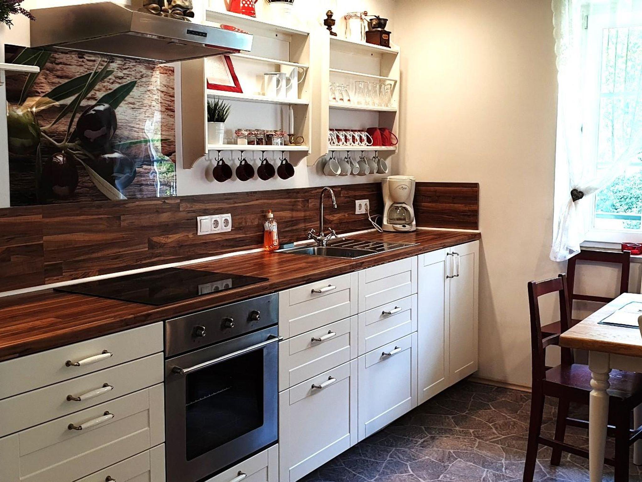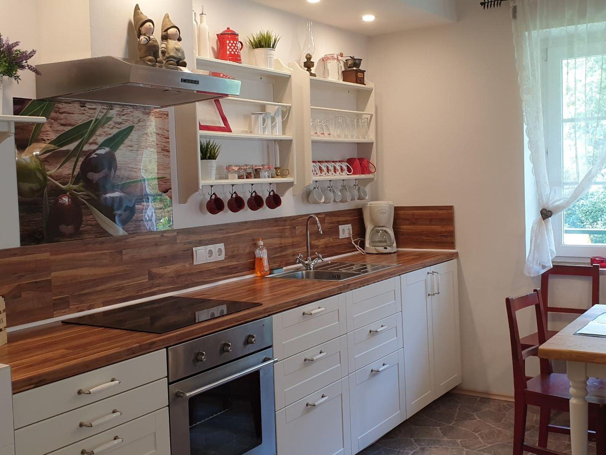 * Große Wohnküche mit Küchenzeile und großem Esstisch für 7-9 Personen - komplett eingerichtet mit E-Herd mit Backofen, Mikrowelle, Kühlschrank, Geschirrspüler, Kaffeefiltermaschine, komplette Geschirrausstattung mit Tischwäsche