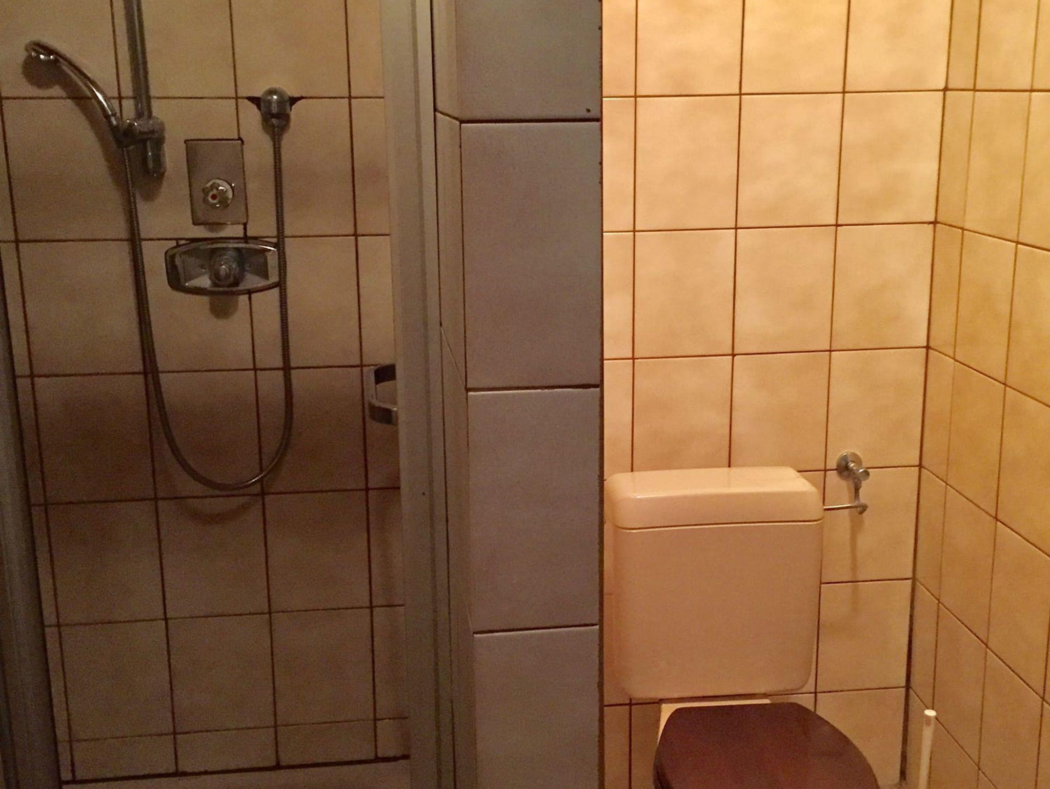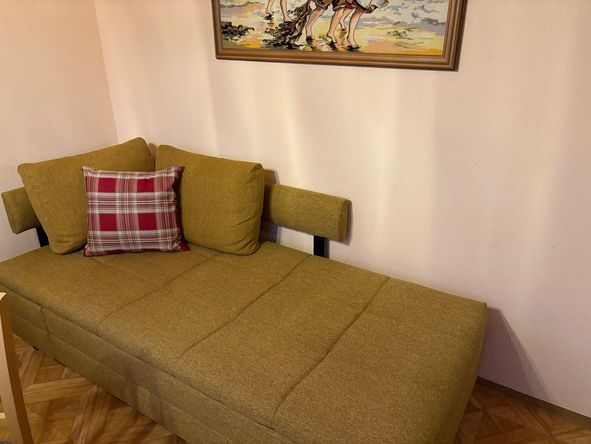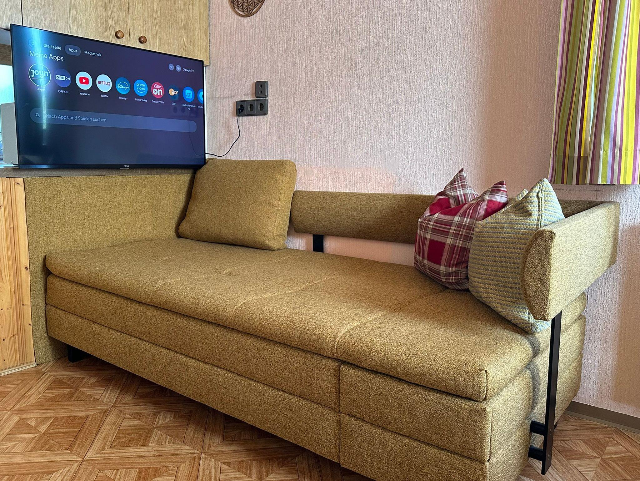 Unsere Ferienwohnung besteht aus einem Vorraum, Bad mit WC, einer Wohnküche mit 2 Sofas und einem Schlafzimmer mit Doppelbett, und einem Abstellraum - bei uns heisst es: die Speis'. Dort befindet sich auch der Kühlschrank und die Gefriertruhe mit dem Frühstücksgebäck. Die Küche ist mit einem Elektroherd mit Backrohr ausgestattet, es gibt auch einen Minibackofen, Mikrowelle, Wasserkocher und eine Kaffeemaschine. Ess- und Kochgeschirr ist vorhanden und ein TV-Gerät ist im Wohnbereich angebracht. Die Essgruppe bietet genug Platz für vier Personen. Die beiden Sofas können in Betten umgewandelt werden. Im Schlafzimmer befindet sich ein Doppelbett und ein Kleiderschrank. Das Badezimmer ist mit Dusche ausgestattet, das WC kann mit einer Falttüre abgetrennt werden.