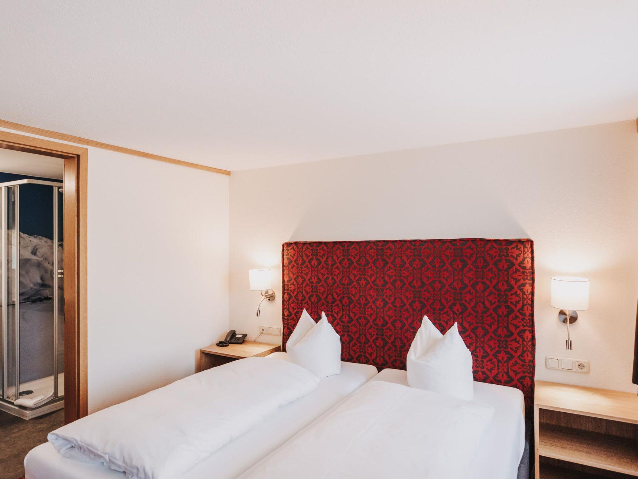 Ausgestattet mit einem Kingsize Bett (180x200cm), mit Dusche oder Badewanne und WC, TV/Radio, Hotelsafe, Wifi und Telefon. Alle Doppelzimmer befinden sich im Haupthaus in ruhiger Lage mit Blick auf die umliegenden Berge, aufgeteilt auf 3 Stockwerke