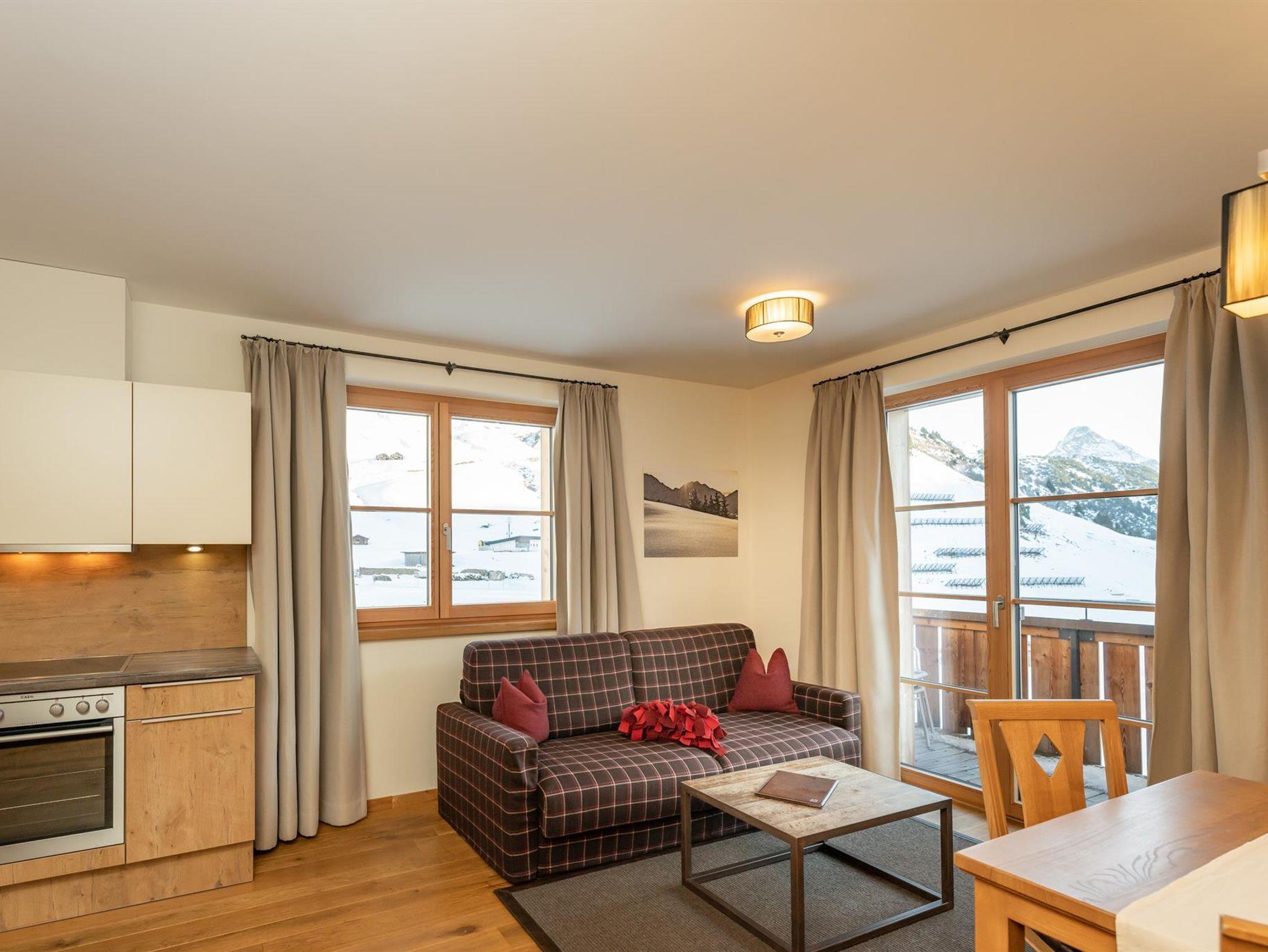 Das sehr beliebte Appartement Mizzi ist 42 m2 groß und verfügt über 1 Doppelzimmer mit rustikaler Altholzverkleidung. Wohnraum mit Sofa, voll ausgestattete Küche, Essbereich und Garderobe. Das Badezimmer verfügt über eine Dusche und WC. Sehr schöner Balkon nach Osten in Richtung Skigebiet.